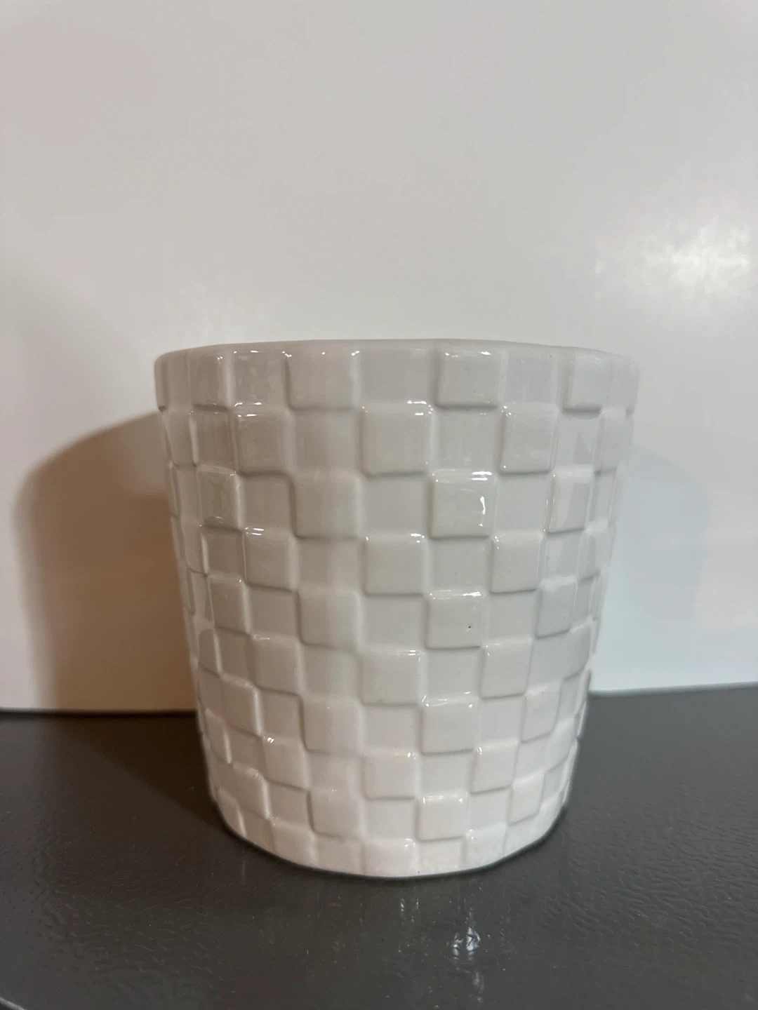 A white ceramic planter pot with a basketweave texture. It's made of durable ceramic material. This pot is good for small to medium-sized plants.