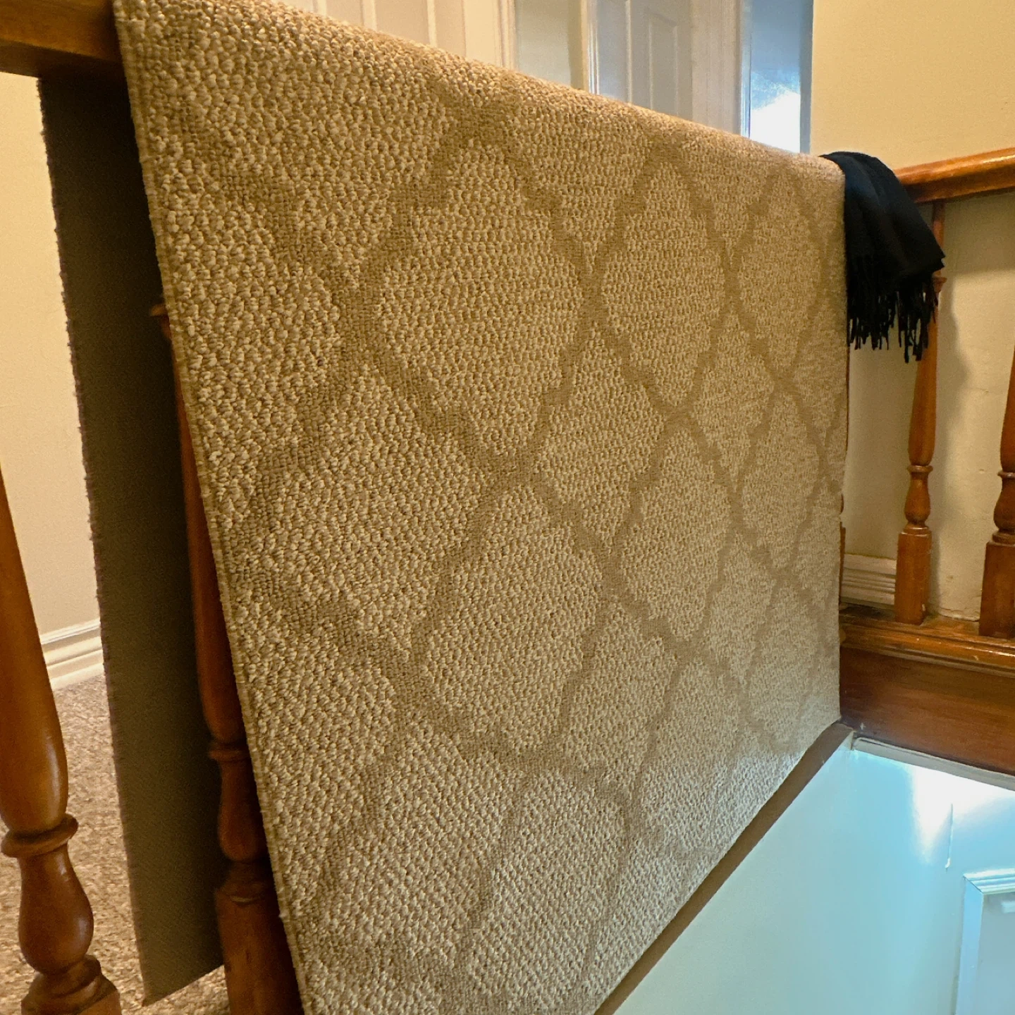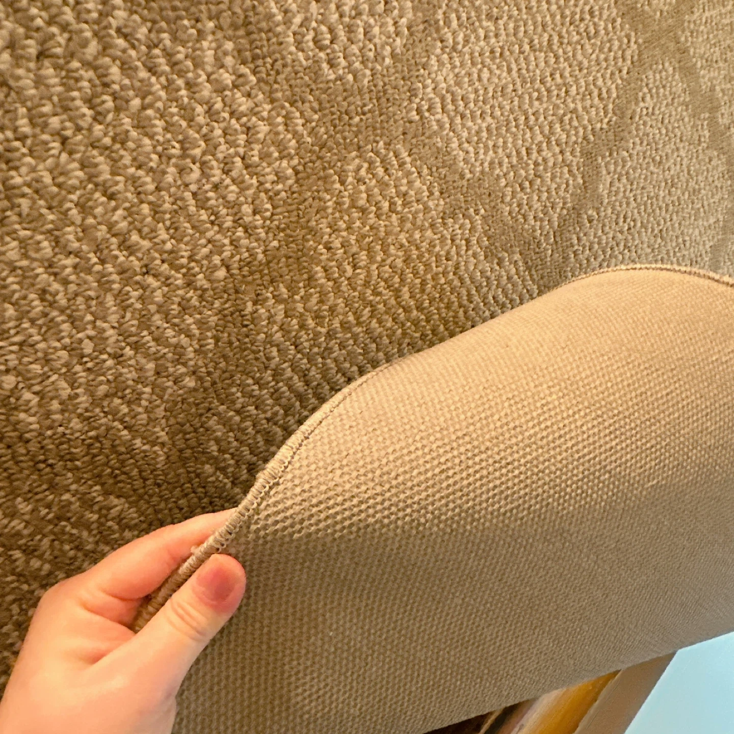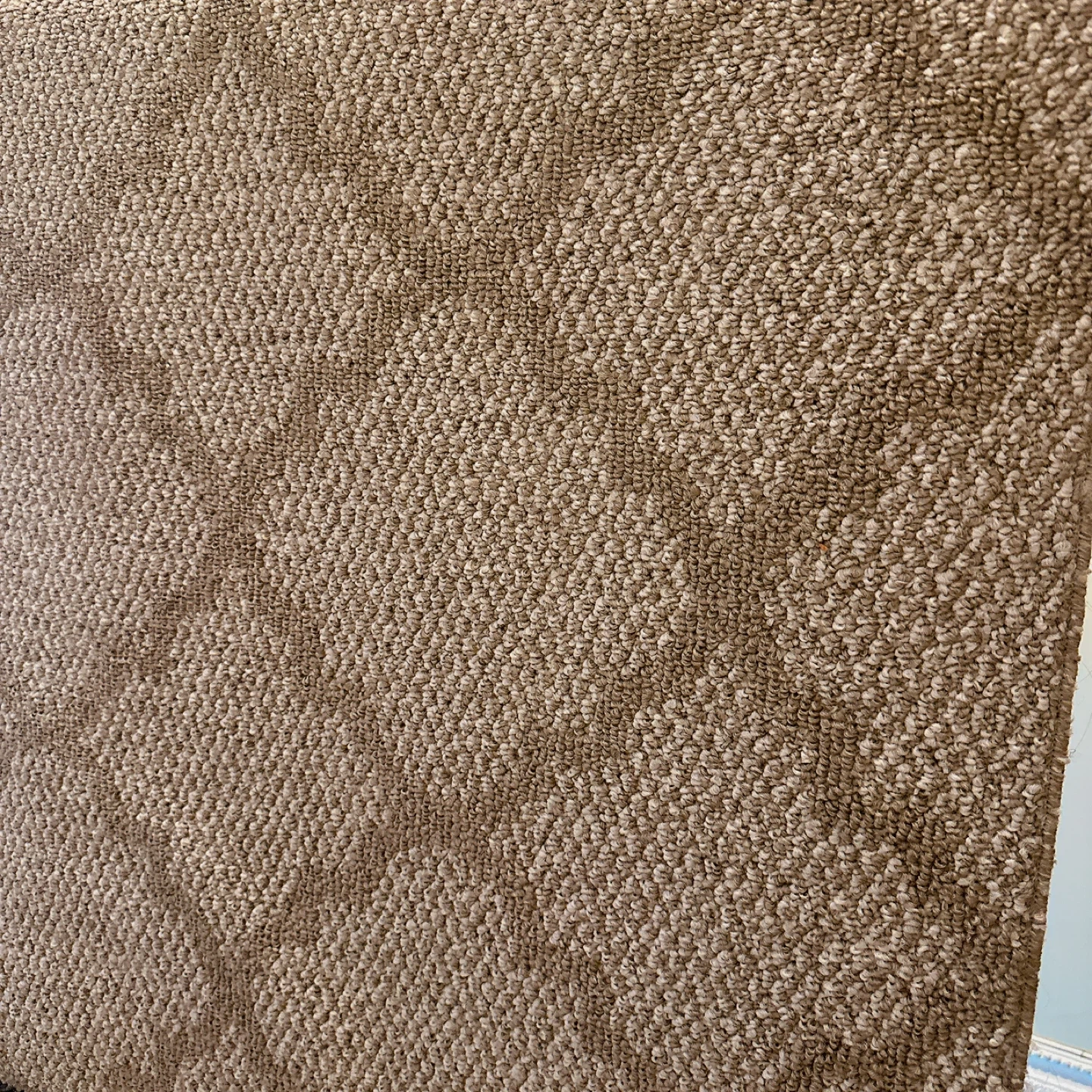 This is a Baldoza carpet. Surface: 100% polypropylene. Backing: Non-Slip Latex. Made in Canada. It's a nice neutral colour with a subtle diamond pattern.