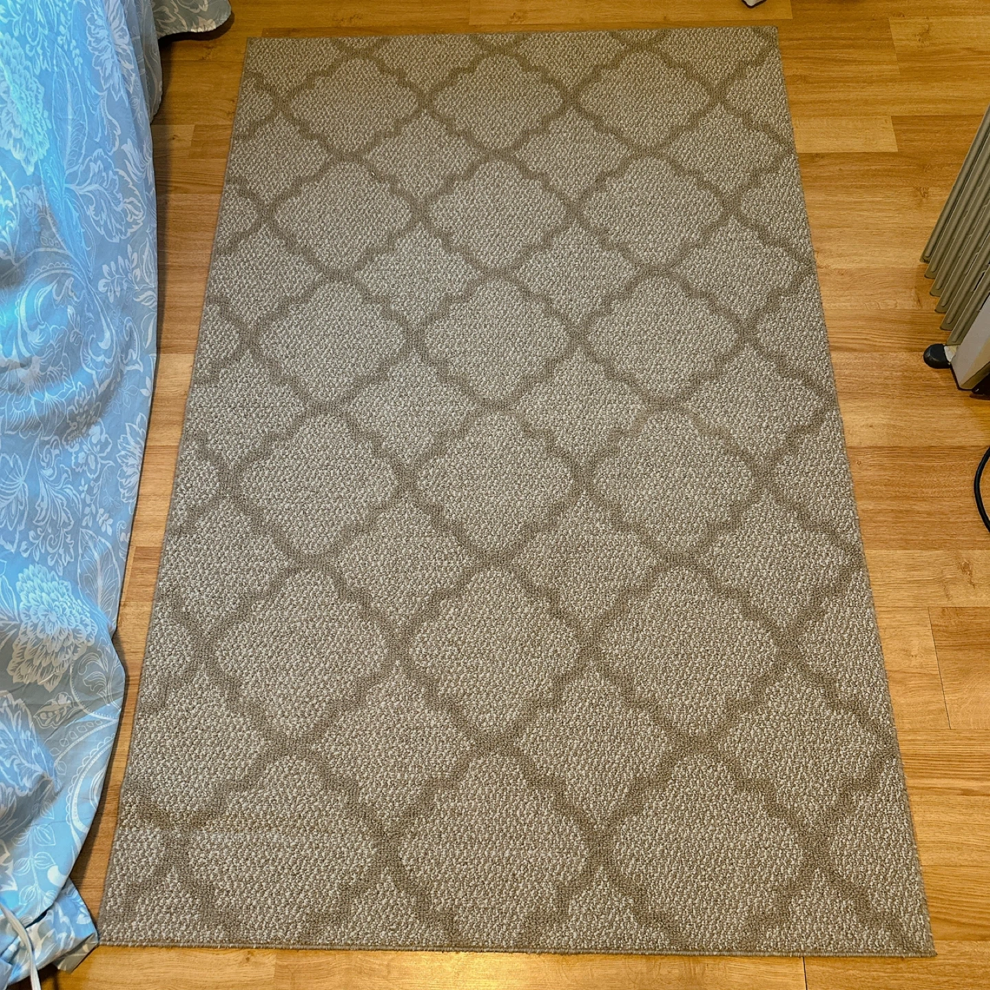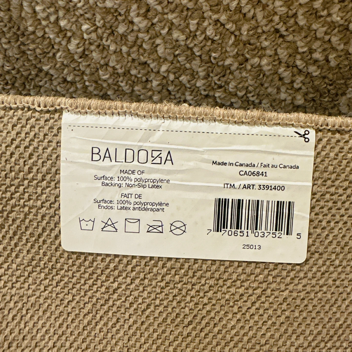 This is a Baldoza carpet. Surface: 100% polypropylene. Backing: Non-Slip Latex. Made in Canada. It's a nice neutral colour with a subtle diamond pattern.