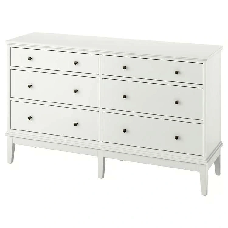 This is the IDANÄS 6-drawer dresser in white from IKEA. It offers ample storage with its six drawers. The dresser has a clean, modern design that fits well in various bedroom styles.