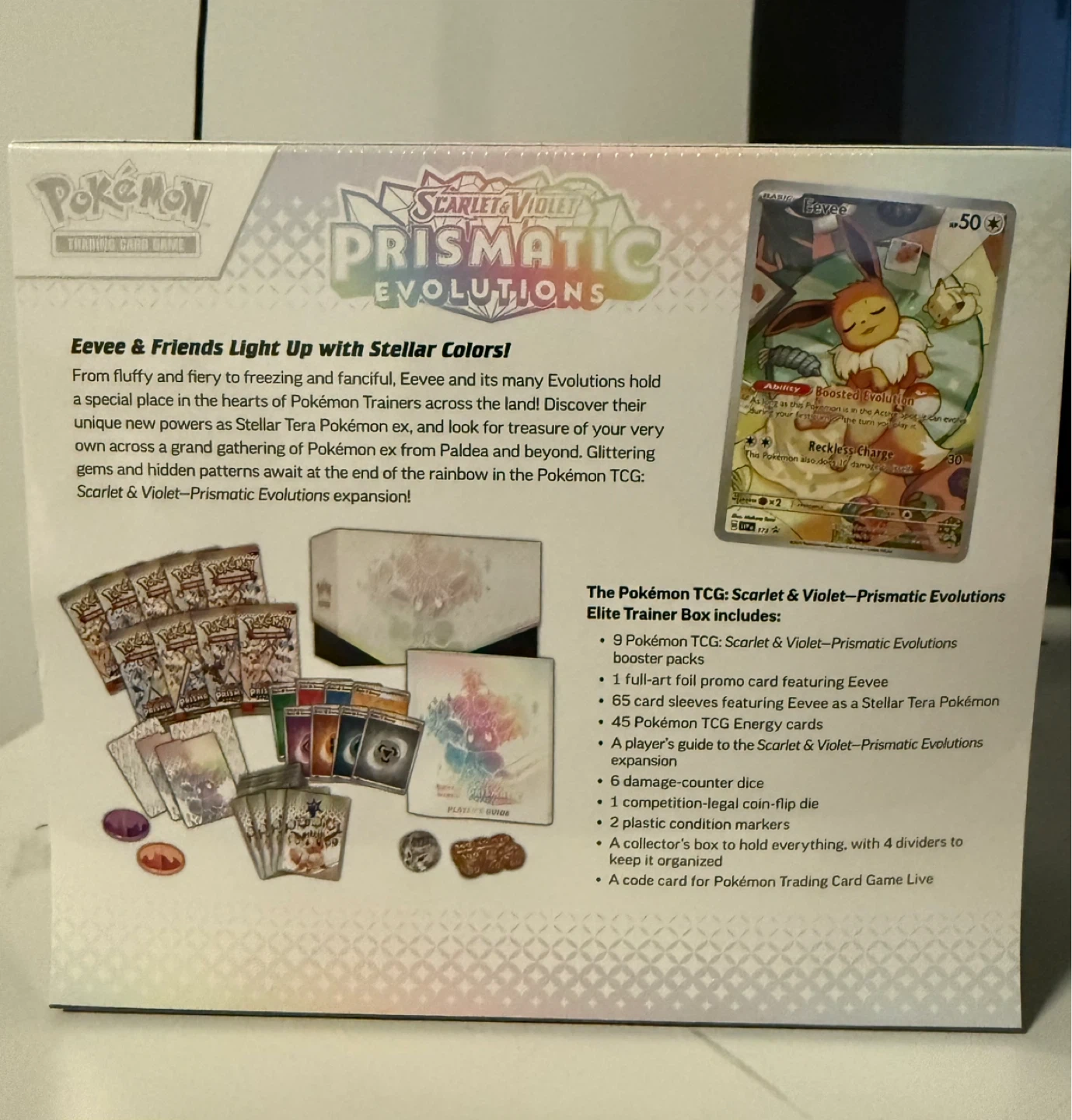 Buy & SellPrismatic Evolutions Elite Trainer BoxPrismatic Evolutions Elite Trainer Box$210Brand New/SealedWHERE TO MEETCheck LocationView MapSELLERThomas De SaBrookhaven100 reviews2 chats·0 favorites·20 viewsSEND CHAT TO SELLERHi Thomas De Sa! I’m interested in your listing.Hi Thomas De Sa! I’m interested in your listing.Get the Karrot app to chatSign In to chat