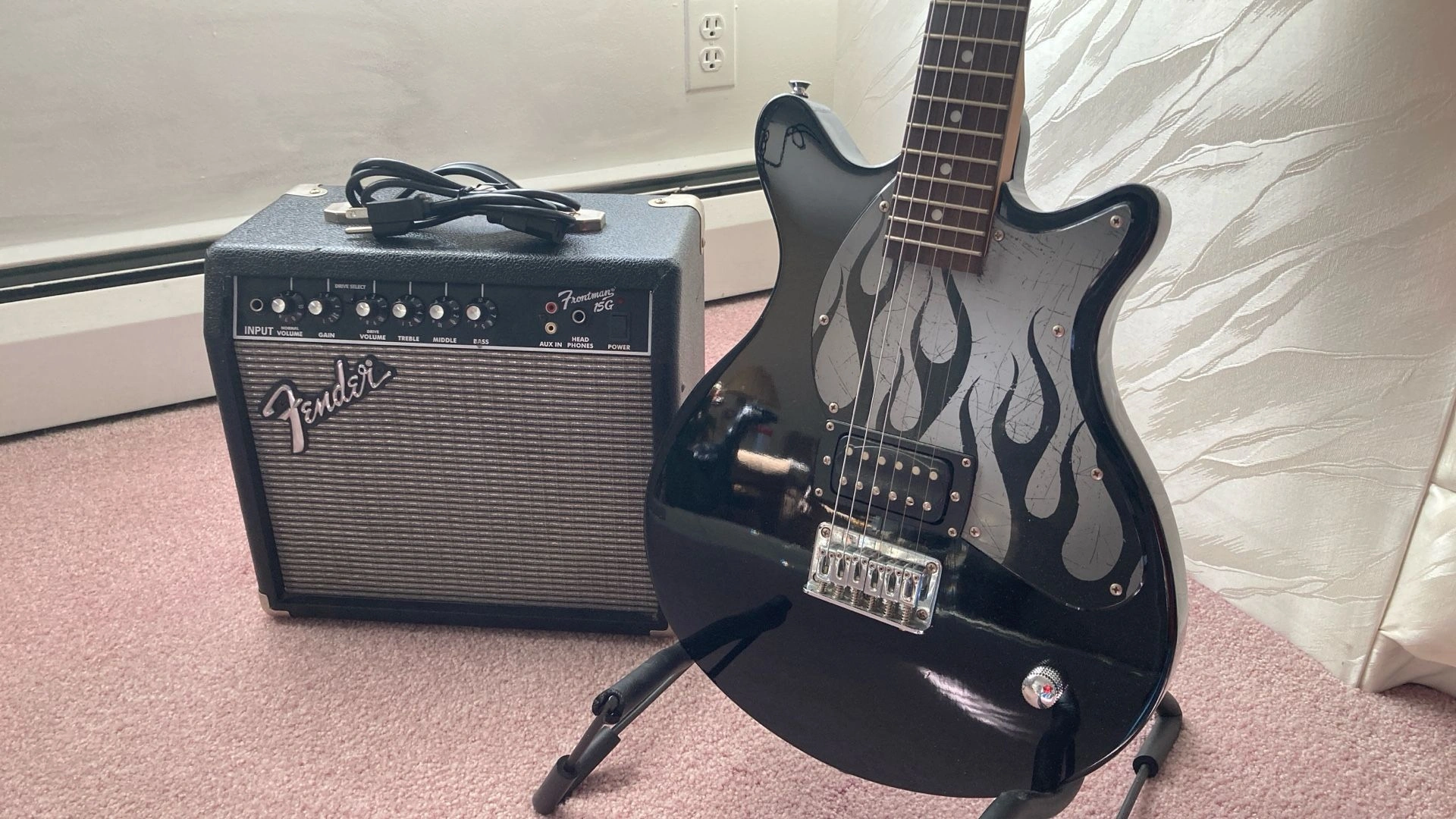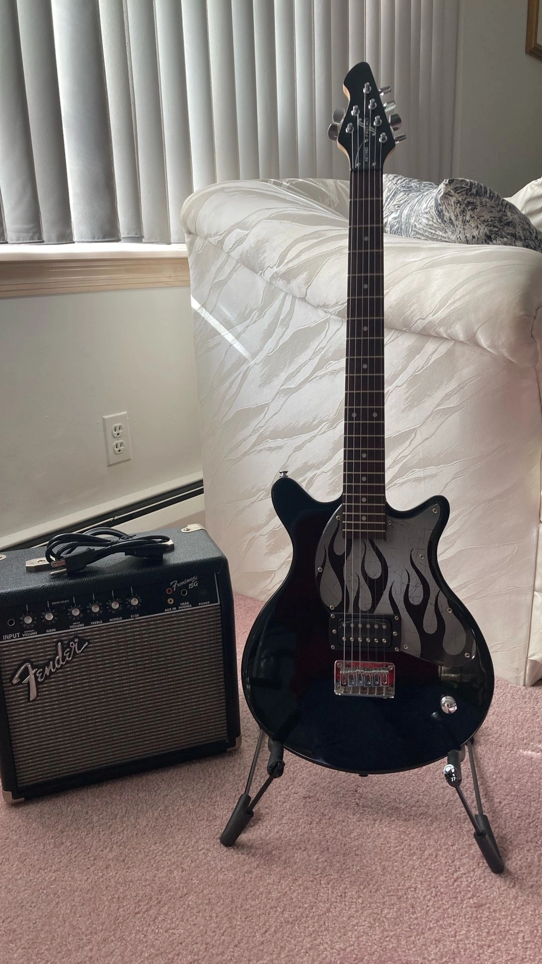 A very cool First Act ME 1980 Double Cut Electric Guitar in like new condition, with a smooth neck and a beautiful Rosewood Fretboard. Includes a Fender Frontman 15G amplifier. The amp features Solid State Output, 15 watts into 8 ohms, an 8" Fender Special Design Speaker, Dual Selectable Channels (Normal and Drive), a 3-Band EQ, Headphone Jack, and Auxiliary Input. Black textured vinyl covering with silver grille cloth. I have several other amplifiers if you're looking for something different. Guitar trades considered.