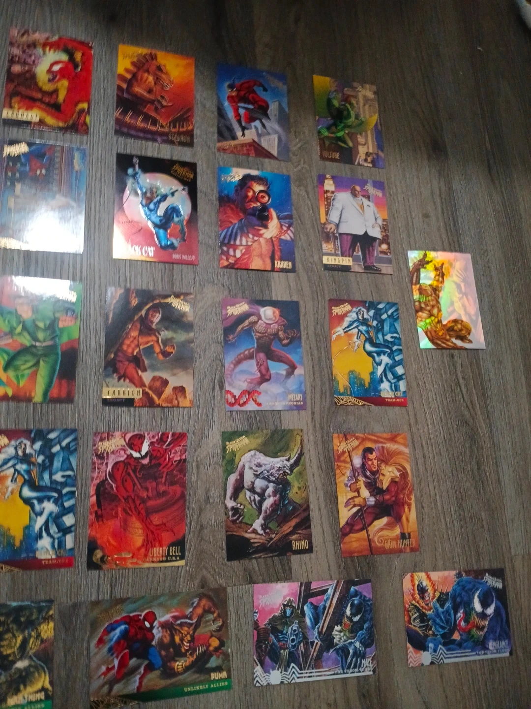 Lot of Spider-Man trading cards featuring various characters and scenes. Includes 2 special holographic limtied edition cards . Great for collectors and fans of the Spider-Man universe!