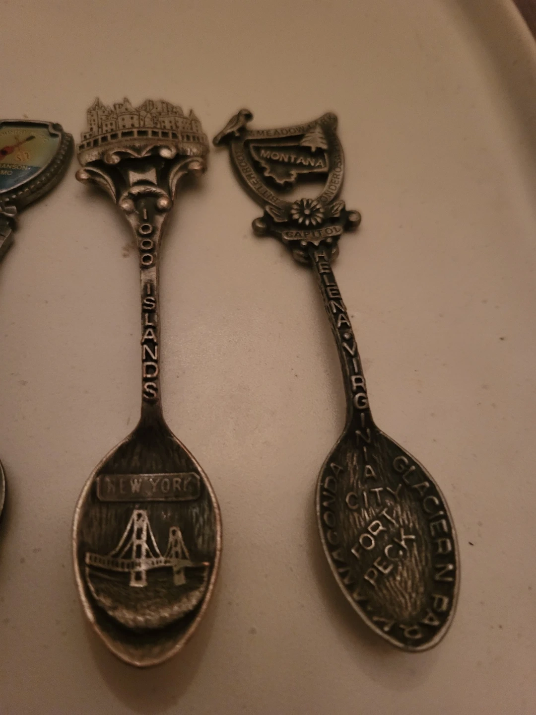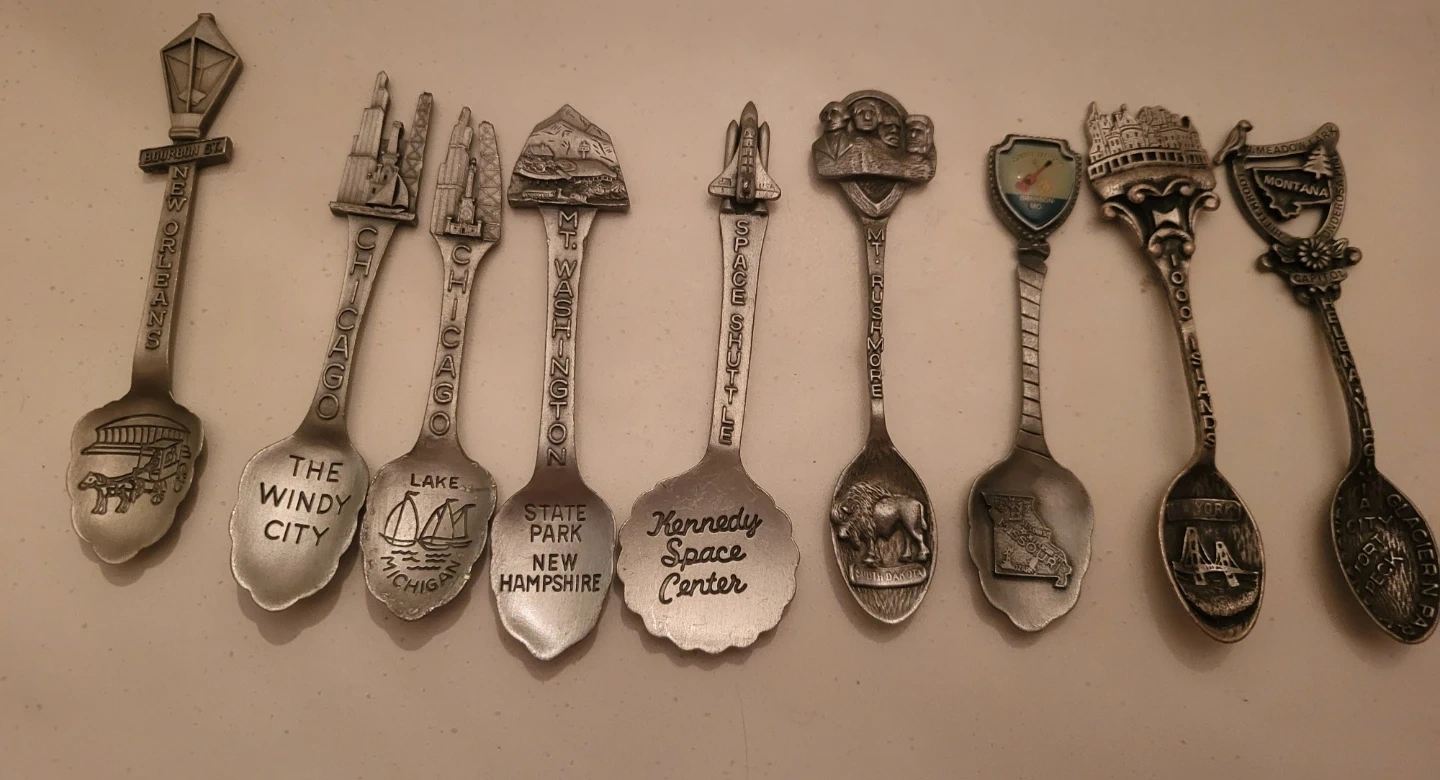 This is a collection of souvenir spoons from various locations including Kennedy Space Center, New Hampshire, and Chicago. These spoons are great for collectors or as mementos of past travels.