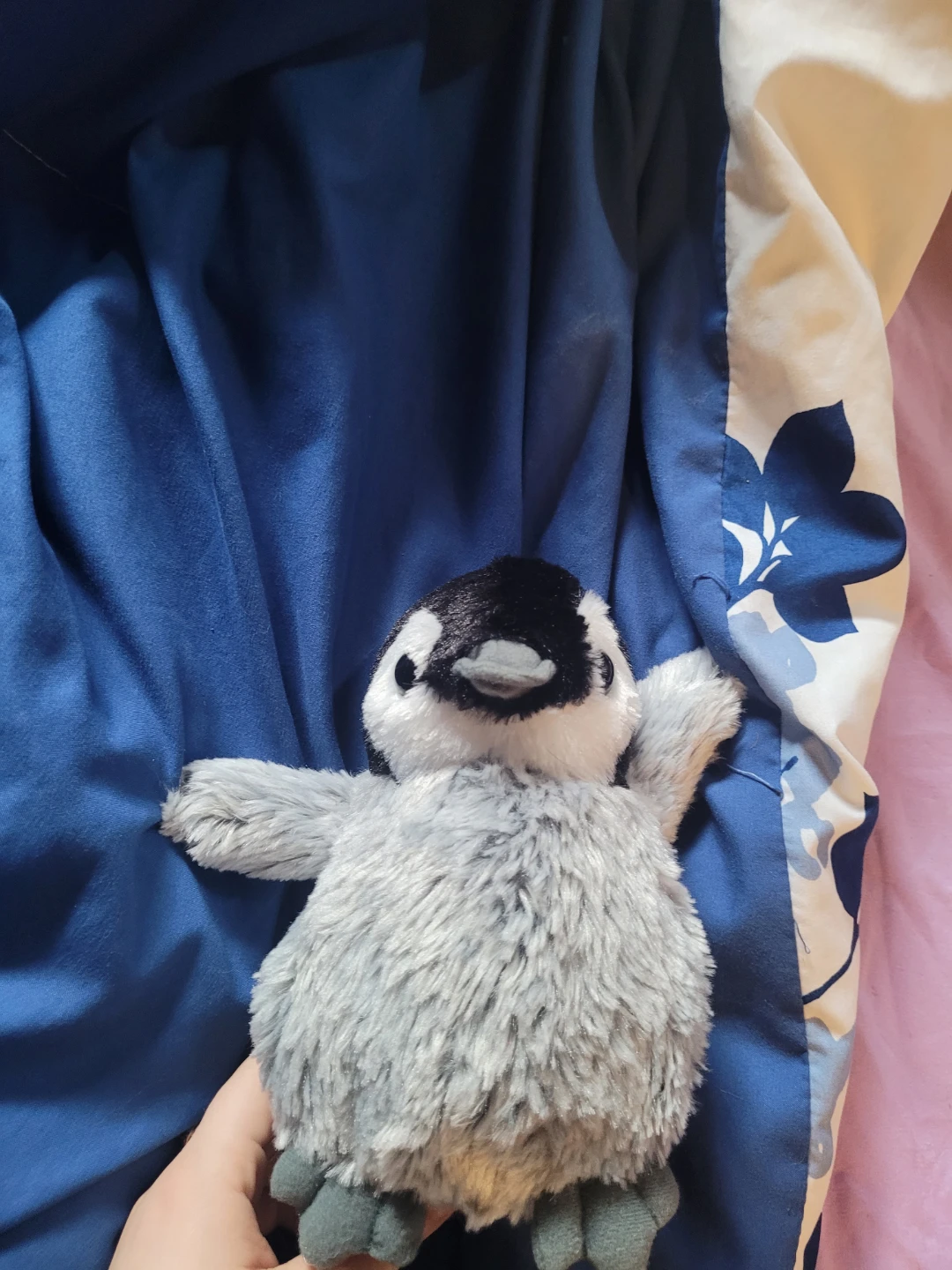 Cute and fluffy plush penguin toy. Soft grey and white fur with black accents. It's perfect for cuddling or a friendly friend