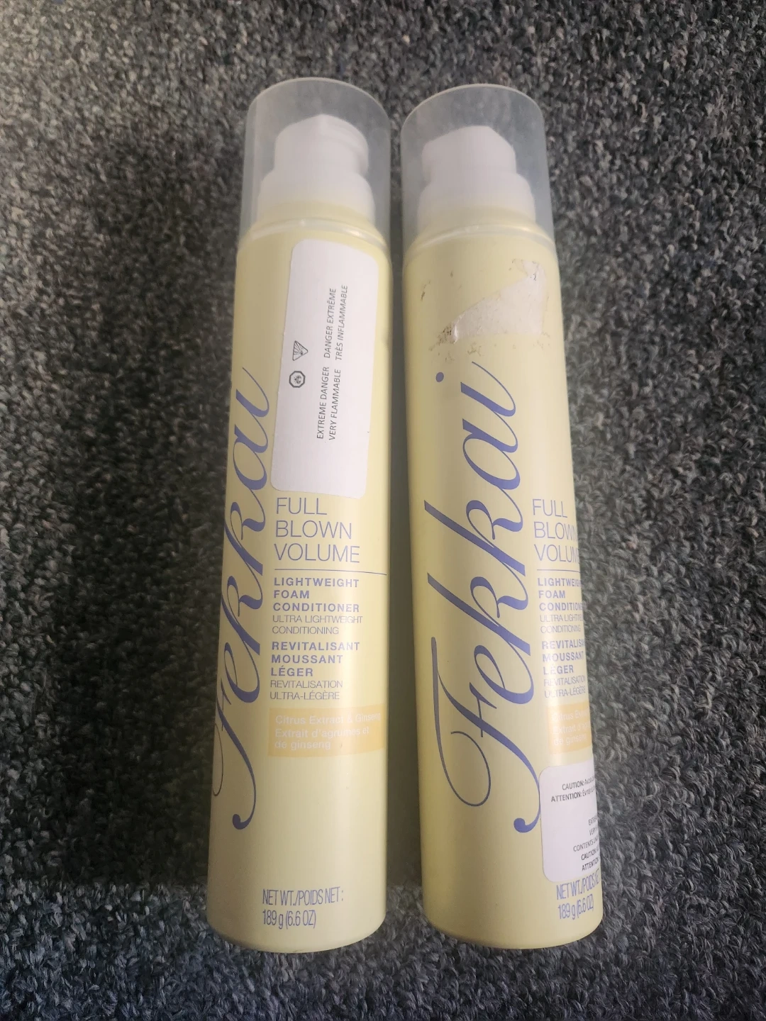 Two bottles of Fekkai Full Blown Volume Lightweight Foam Conditioner. Each can contains 189g (6.6 oz). The products are formulated with citrus extract and ginseng.