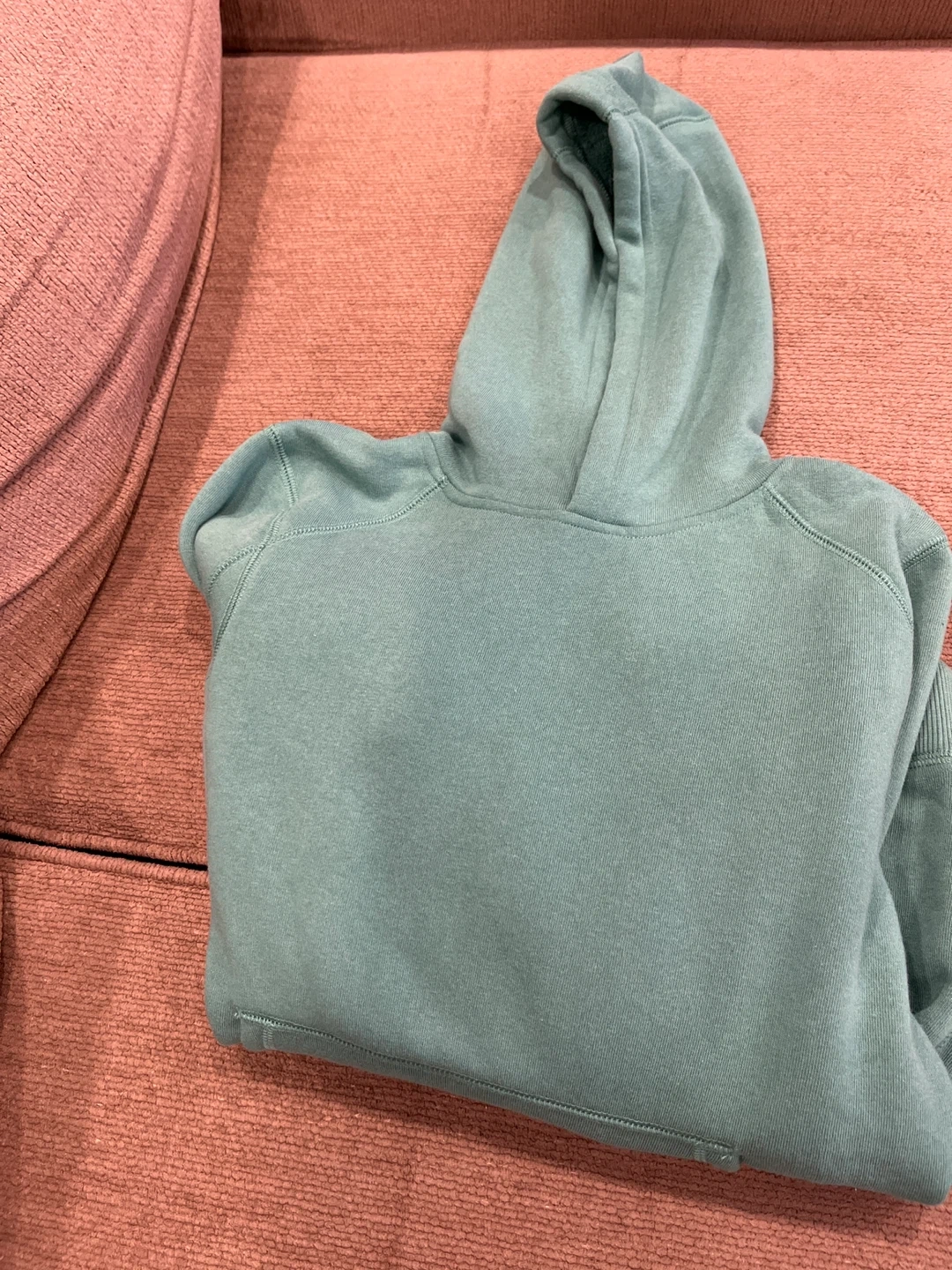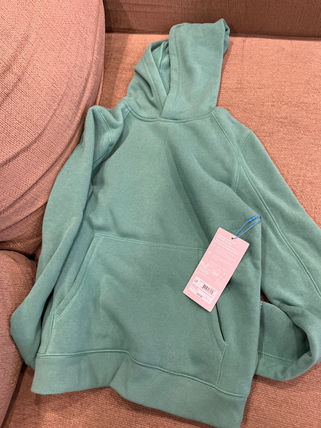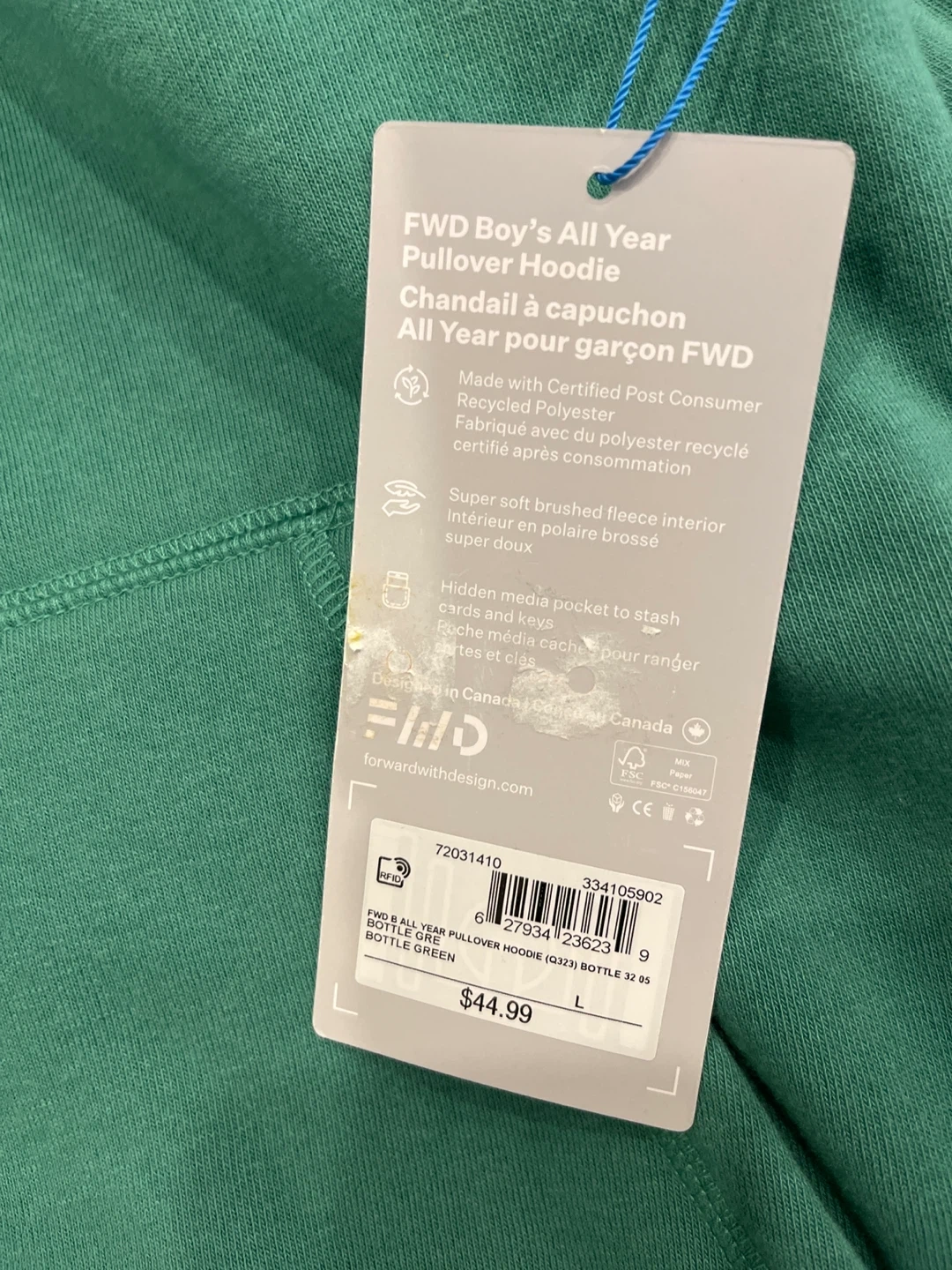 This is a FWD Boy's All Year Pullover Hoodie in bottle green. It's made with certified post-consumer recycled polyester and features a super soft brushed fleece interior. It includes a hidden media pocket to stash cash and keys.Size L
