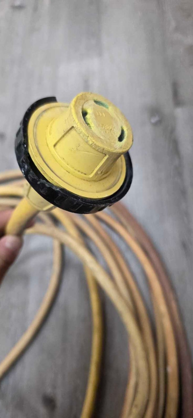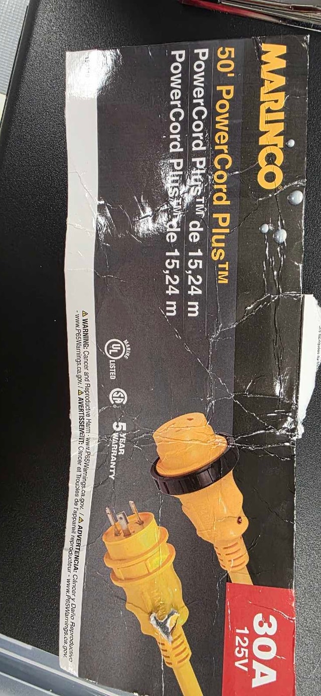 I'm selling a used Marinco 50' PowerCord Plus, a heavy-duty 30A 125V extension cord perfect for RVs, boats, or generators. The cord is 50 feet long, providing ample reach for various power needs. As you can see from the pictures, it is in well used condition.