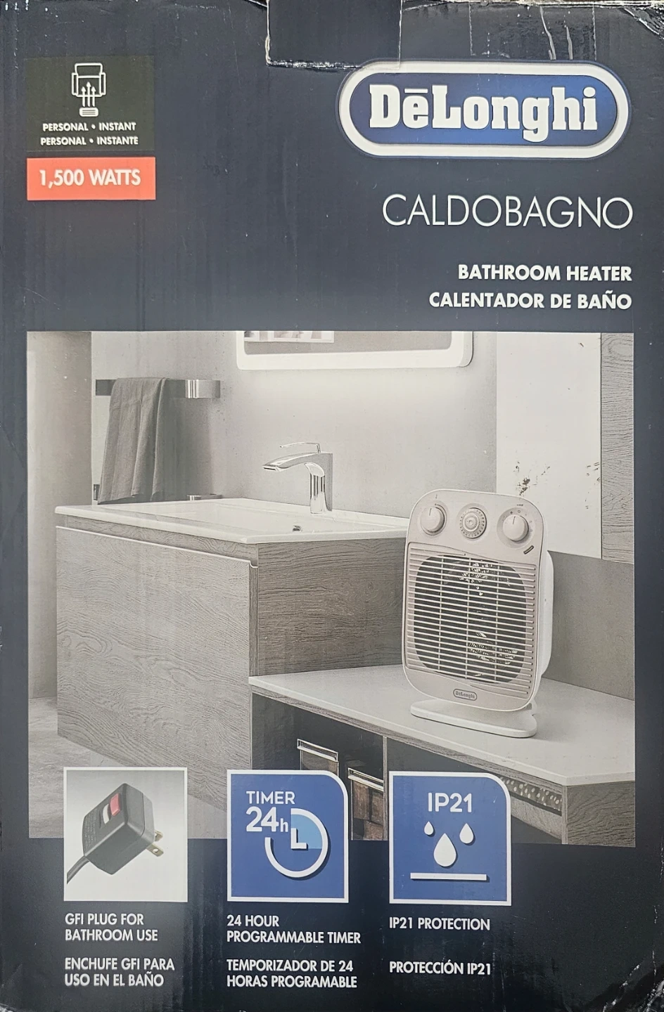 This DeLonghi Caldobagno bathroom heater provides 1,500 watts of power. It features a 24-hour programmable timer and IP21 protection. The unit is designed for bathroom use with a GFI plug.