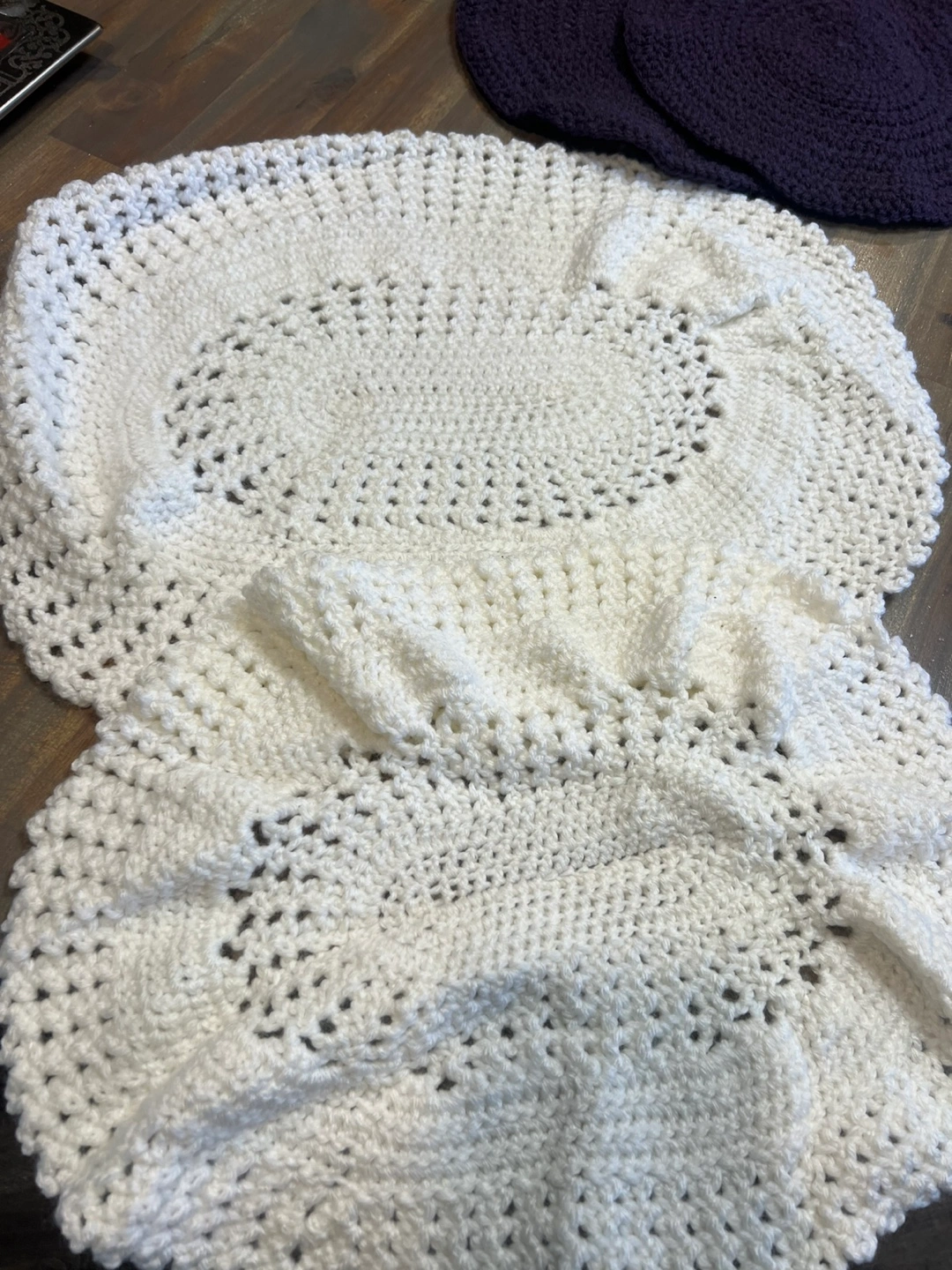 Selling a set of three handmade crocheted table mats or doily’s. There come in a white, a lovely cream, and deep plum. They are in great condition- never used. Hand made. PICK UP LOCATION: Marlborough.