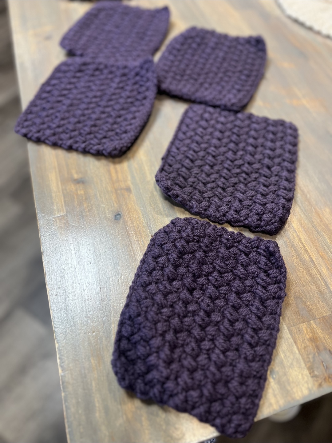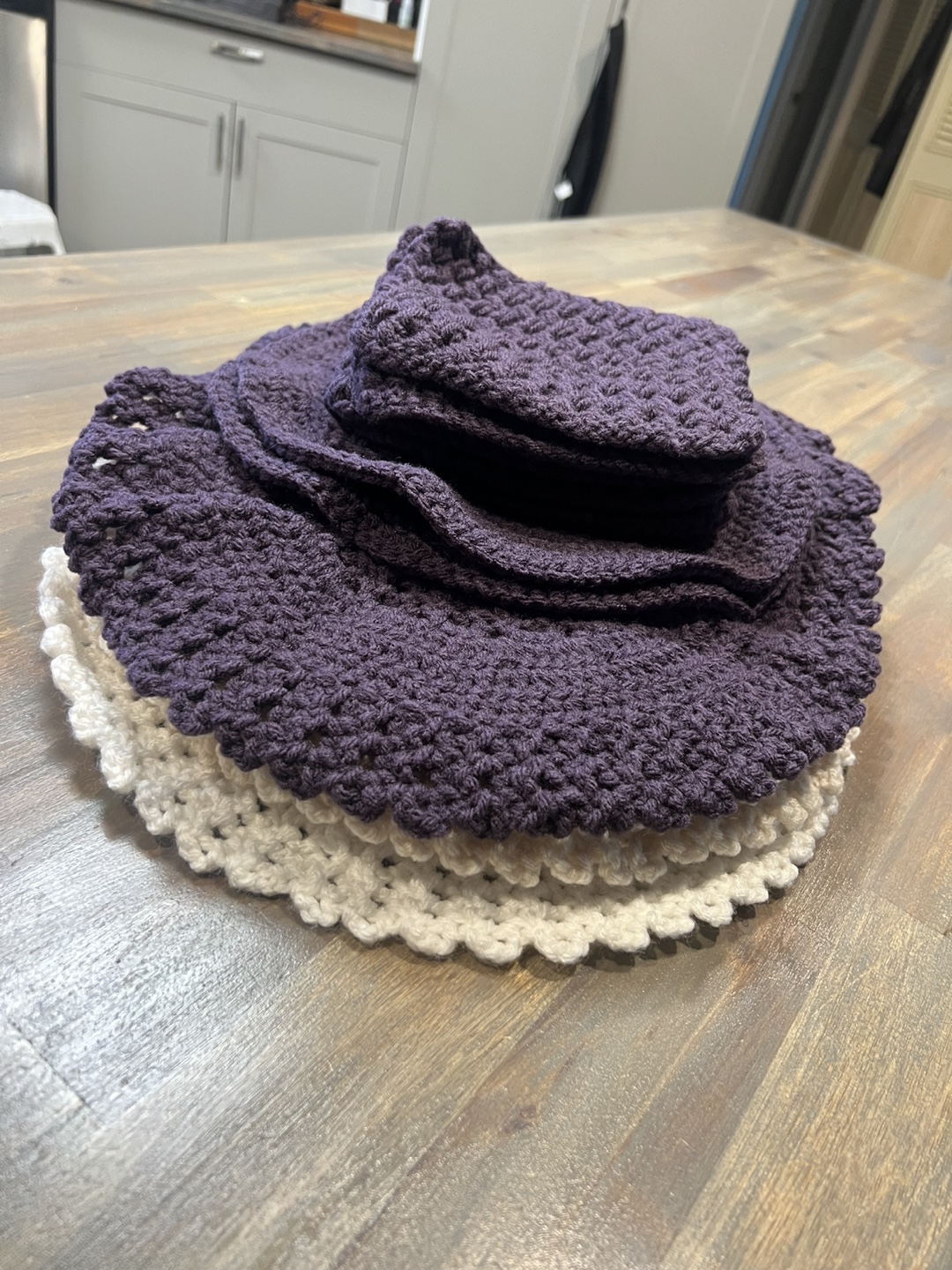 Selling a set of three handmade crocheted table mats or doily’s. There come in a white, a lovely cream, and deep plum. They are in great condition- never used. Hand made. PICK UP LOCATION: Marlborough.