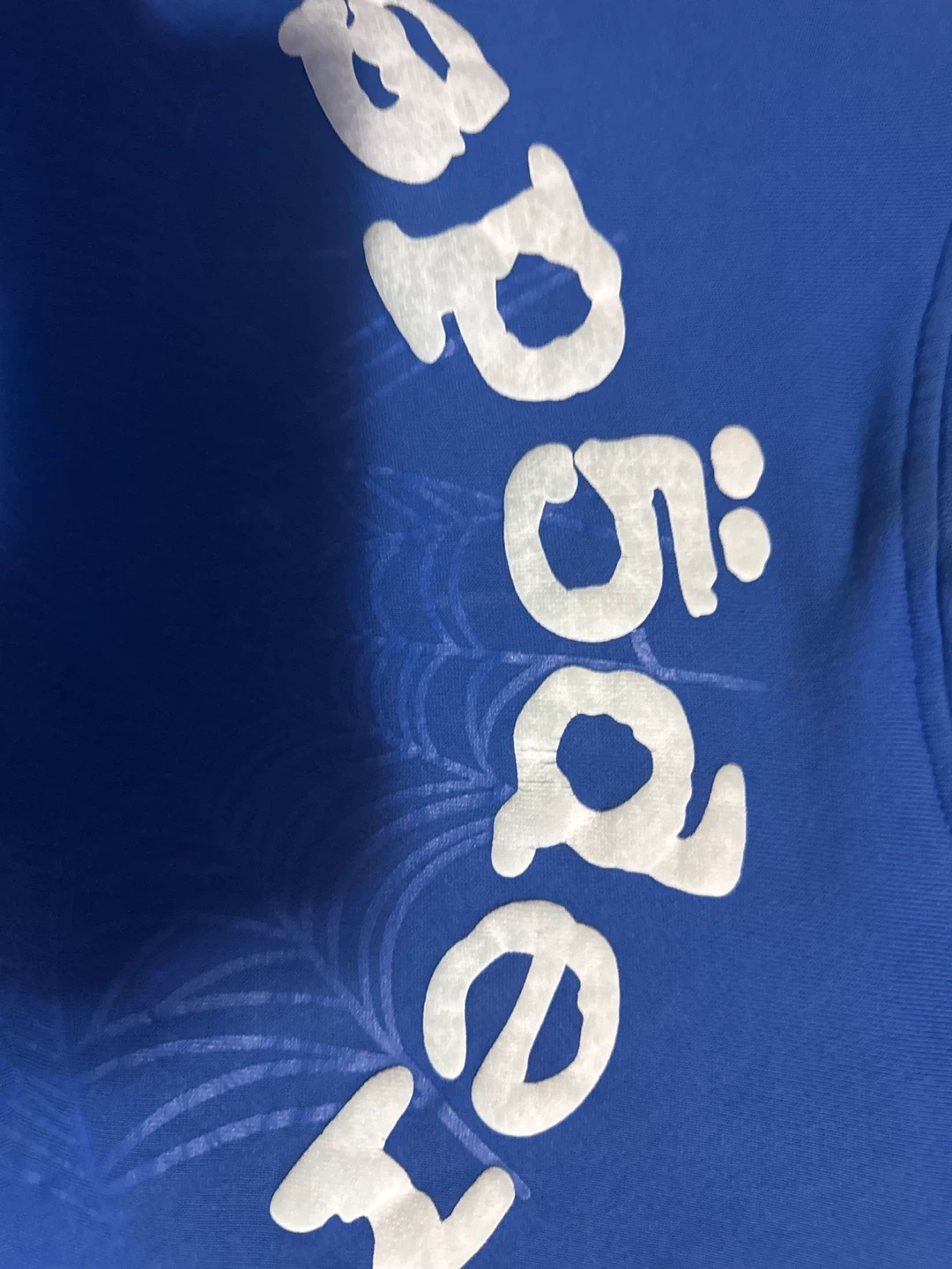 Blue hoodie with a white spider-web graphic on the front. It's a size medium. There's some minor damage to the front pocket area.