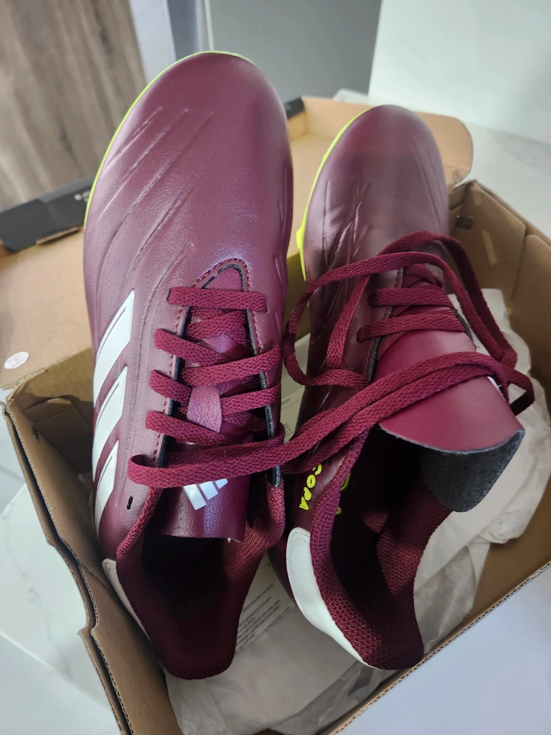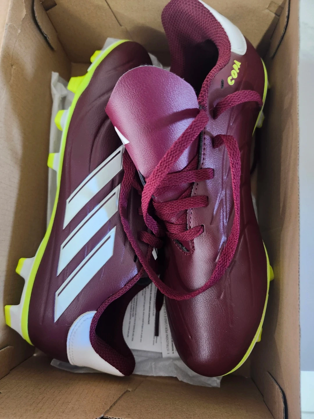 Adidas F50 Club Messi soccer cleats in a burgundy colour. These cleats are size 5.5 US. They're designed for football and soccer.