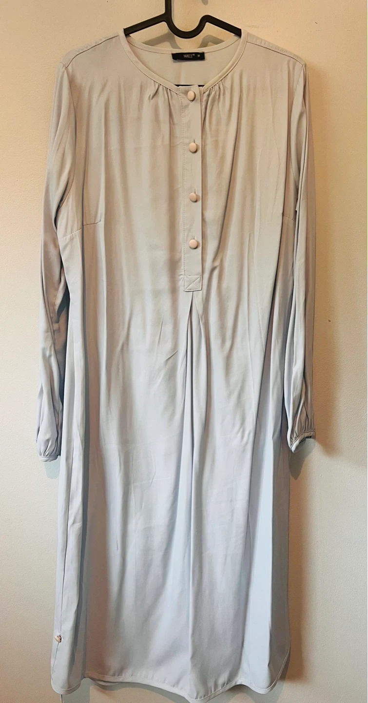 Light blue modest dress. Size medium. Features a round neckline with button-up detailing and gathered pleats at the front. Long sleeves with elastic cuffs. This dress is suitable for various occasions. Brand new, never worn.