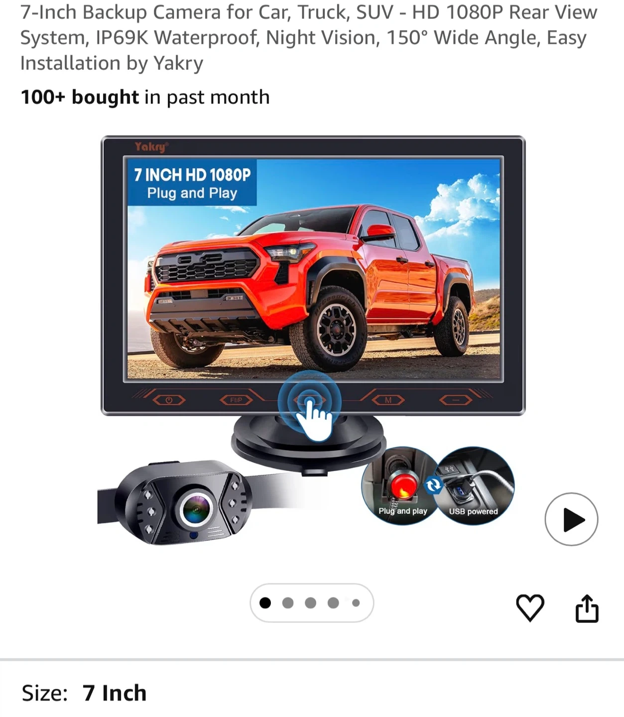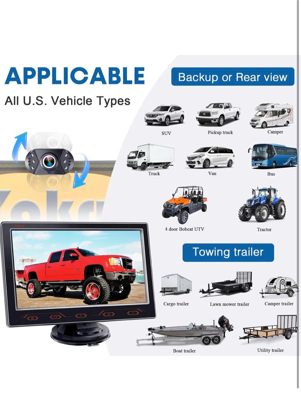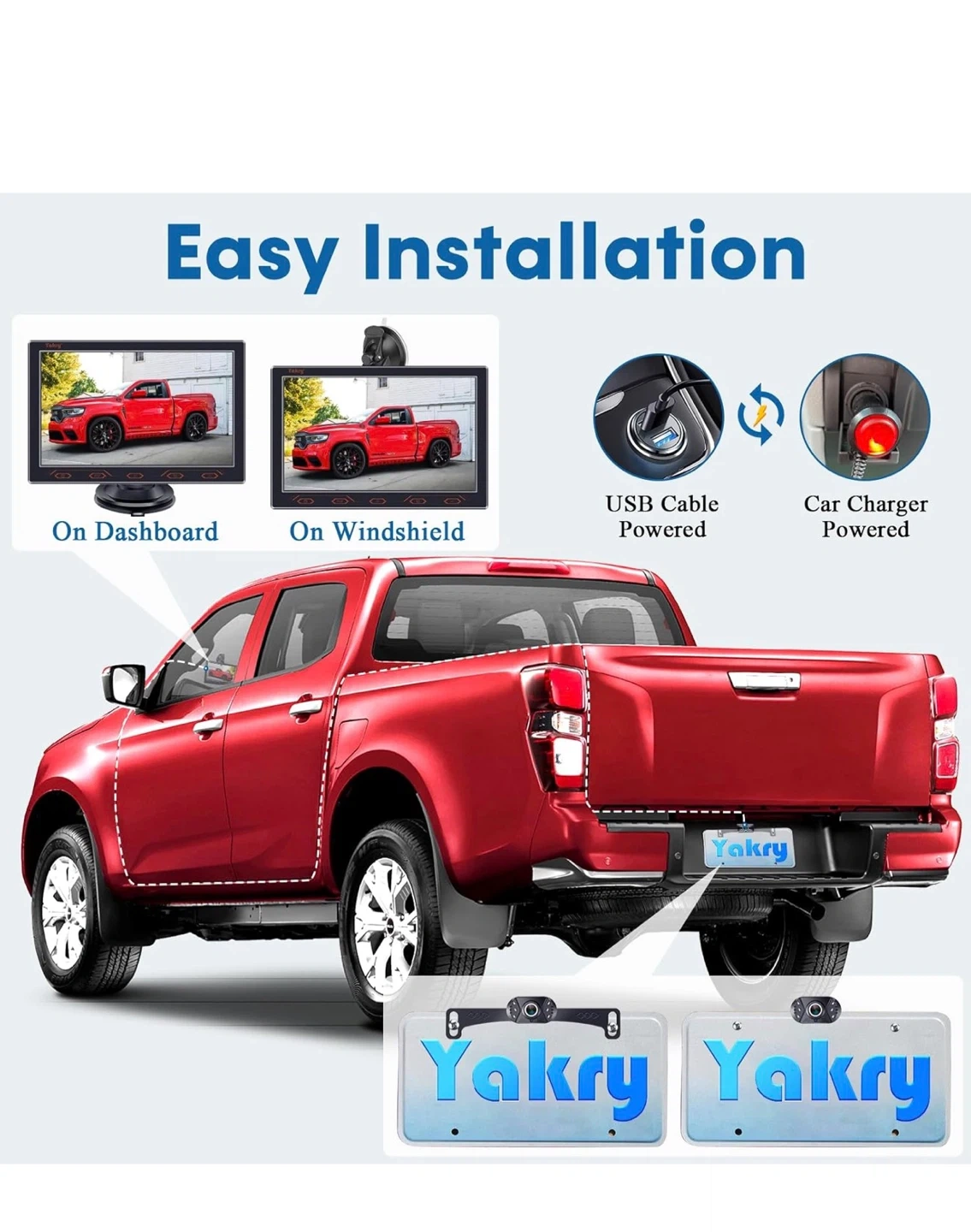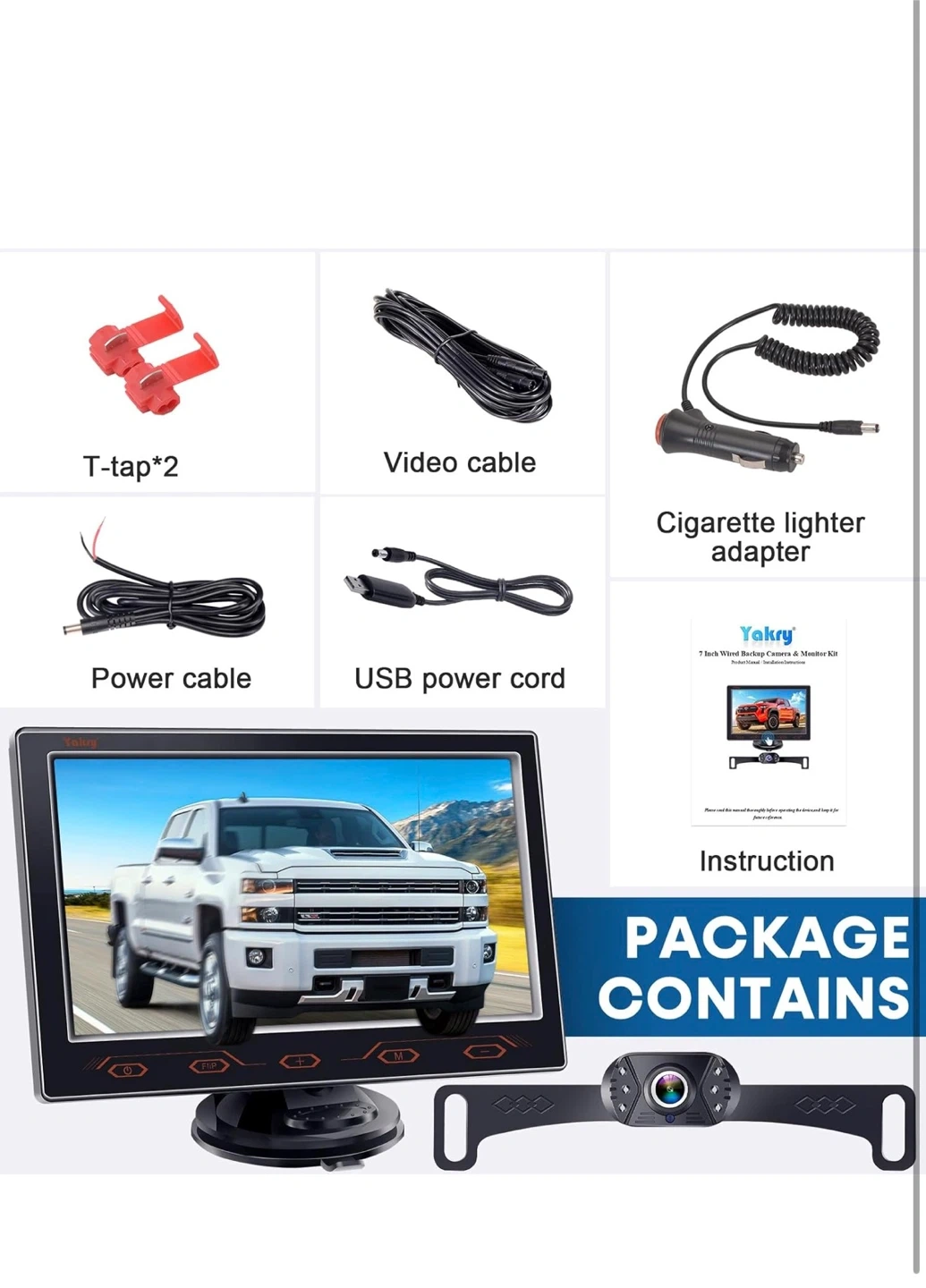 This is a Yakry 7-inch backup camera monitor system. It's a 1080P HD monitor with IPS display that fits all angles. The system features signal without delay and is USB or car charger powered.