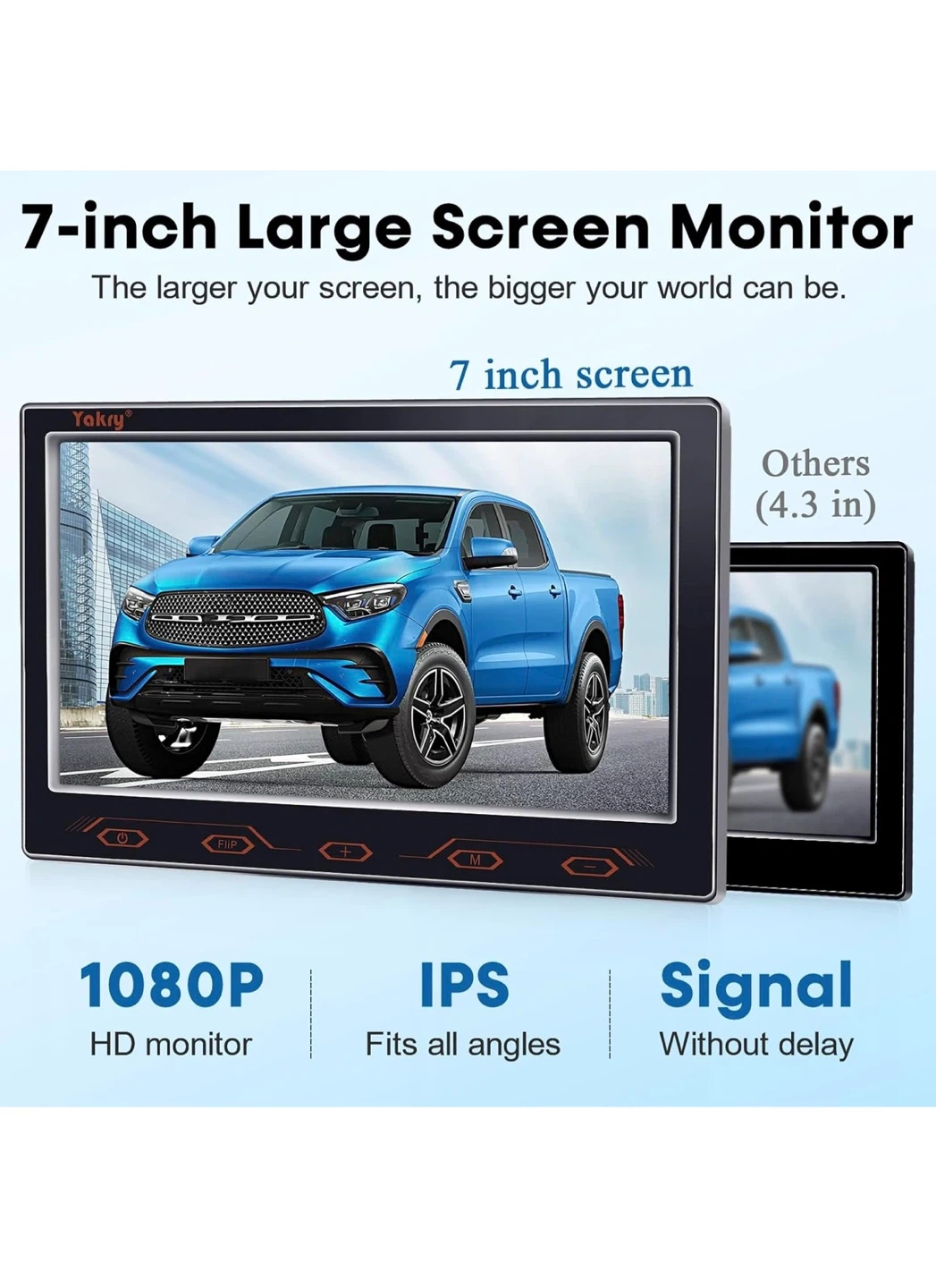 This is a Yakry 7-inch backup camera monitor system. It's a 1080P HD monitor with IPS display that fits all angles. The system features signal without delay and is USB or car charger powered.