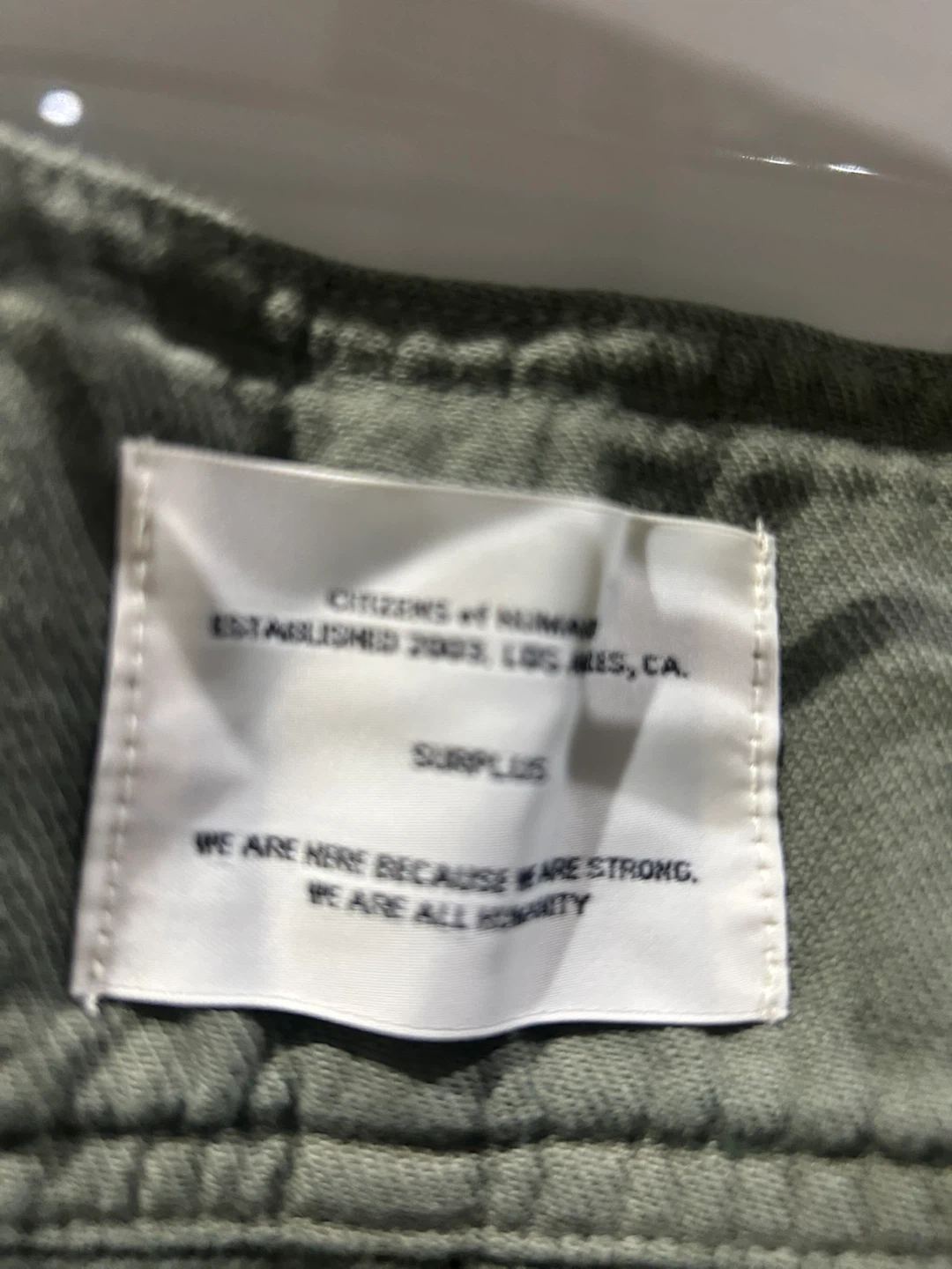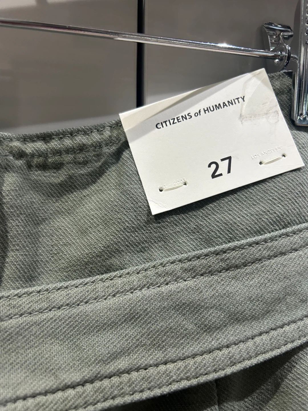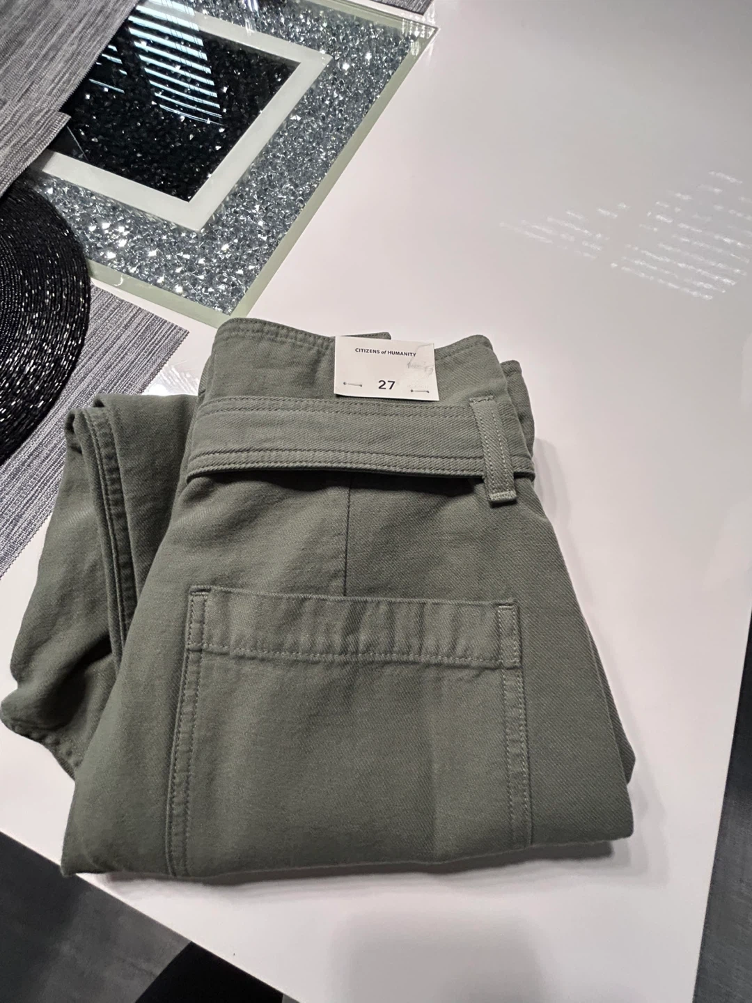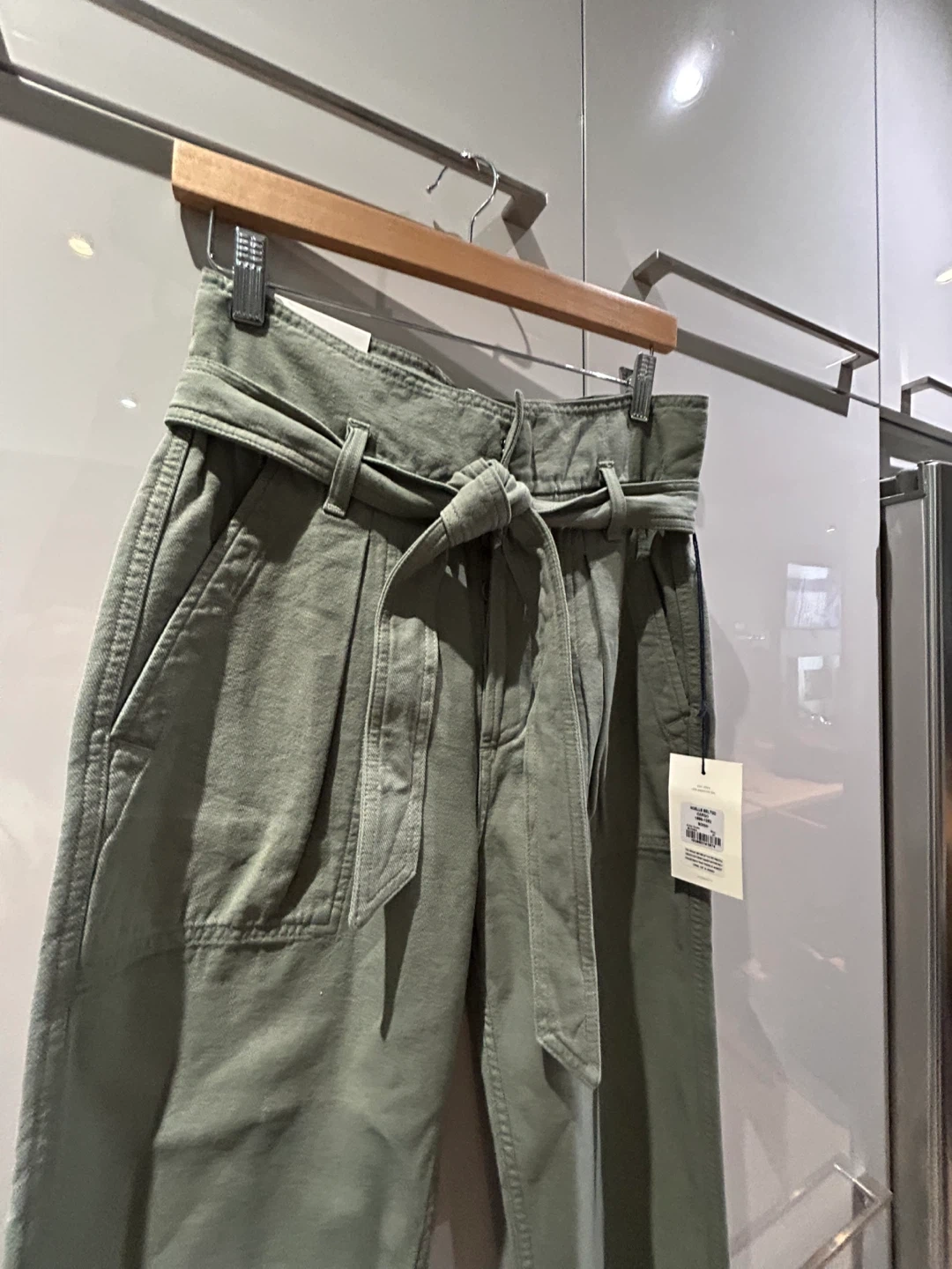 Citizens of Humanity surplus belted pants in an olive green colour. Features a button and zip closure with a tie belt. Utility style pockets.