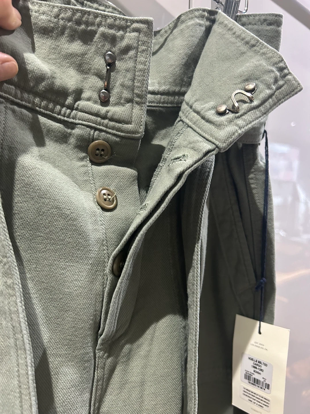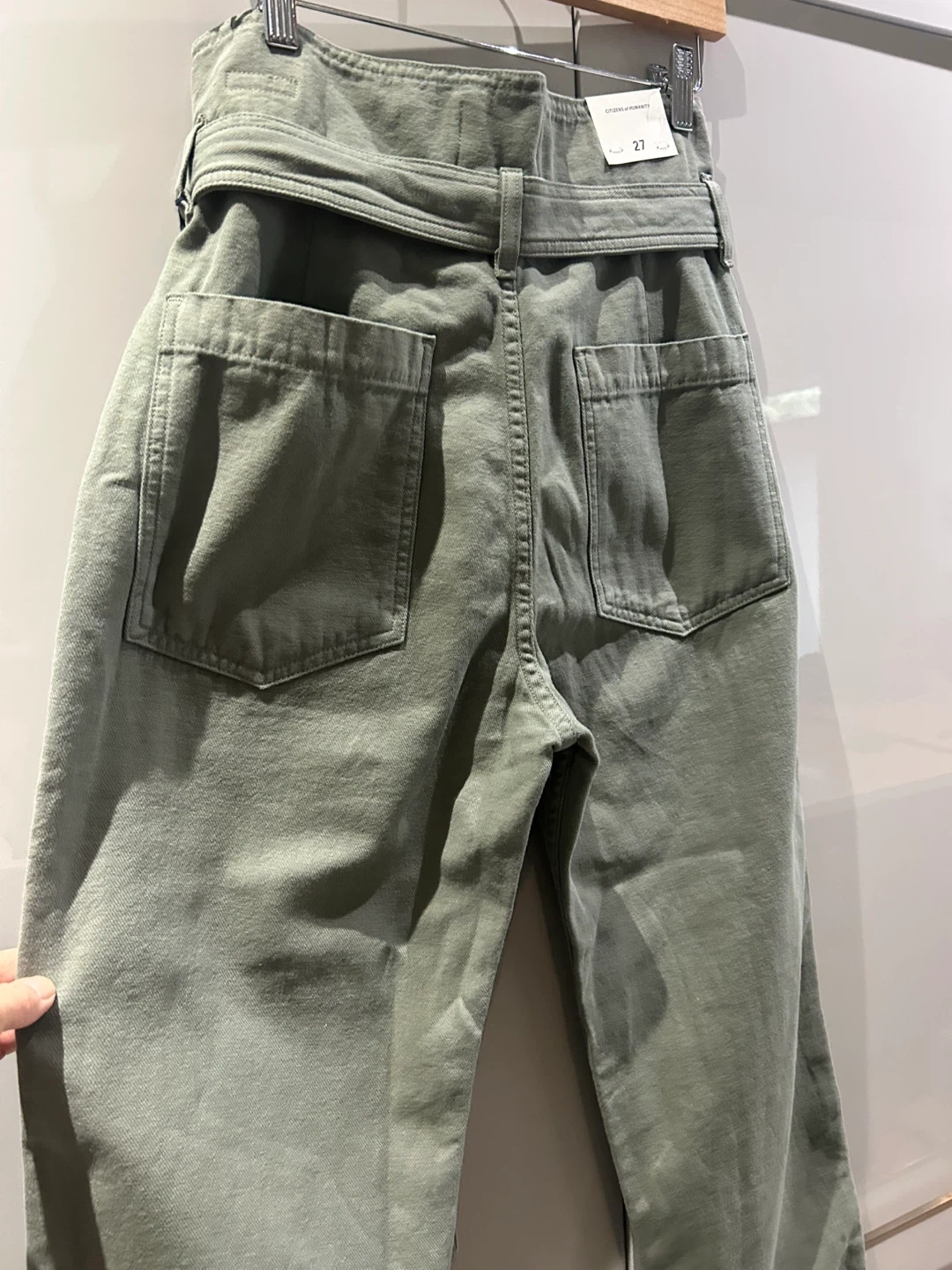 Citizens of Humanity surplus belted pants in an olive green colour. Features a button and zip closure with a tie belt. Utility style pockets.