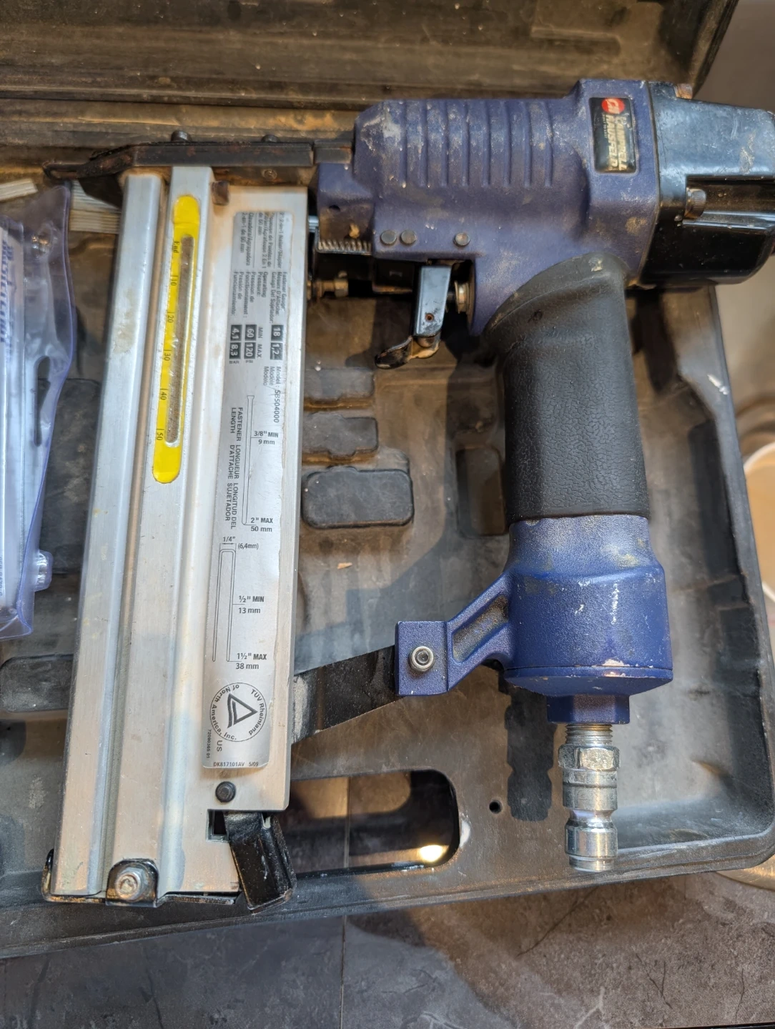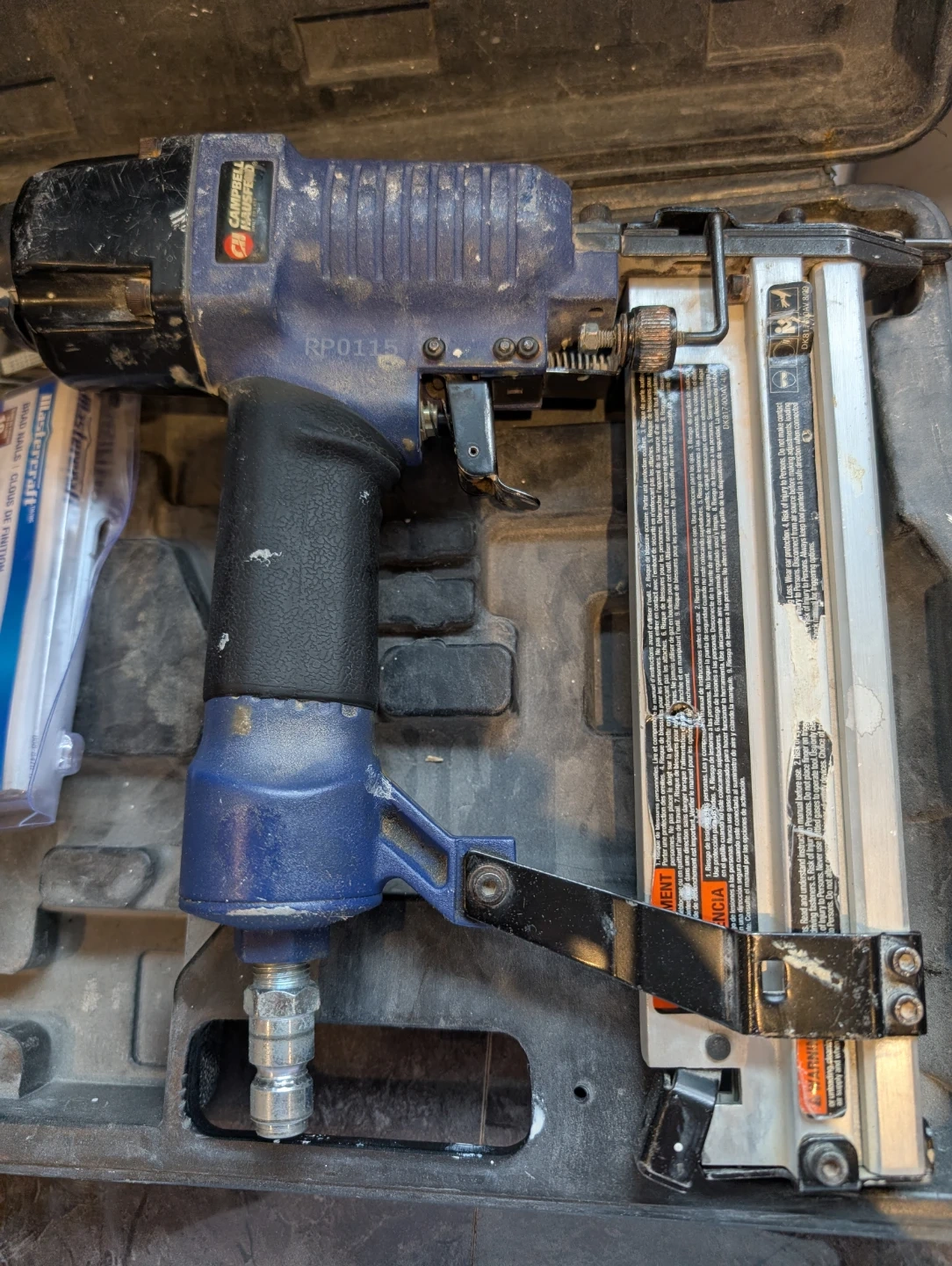 Campbell Hausfeld RP0115 air nailer, comes in a case. It's a powerful tool for various nailing tasks. Uses standard nails for convenience.