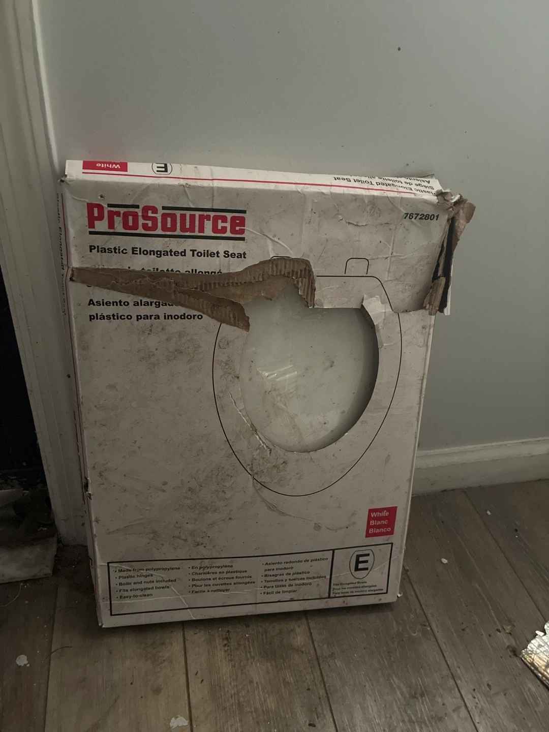 Selling a ProSource plastic elongated toilet seat in white. It's made from polypropylene and includes plastic hinges, bolts, and nuts. It's designed to fit elongated bowls and is easy to clean. Box included