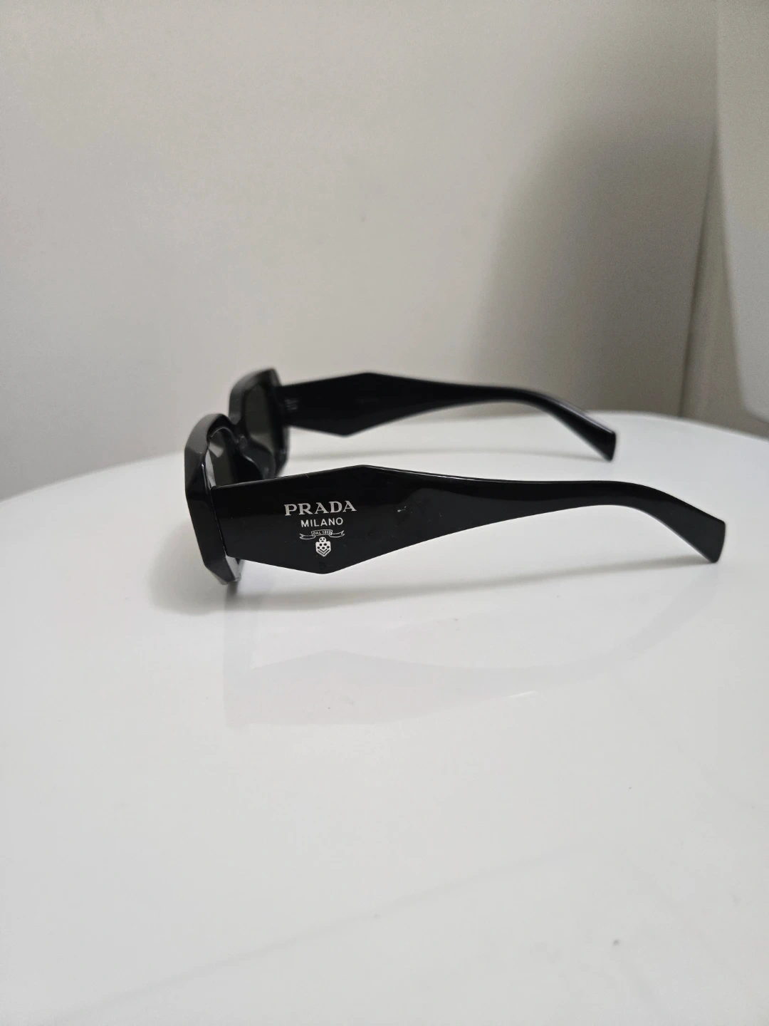 Black Prada sunglasses with a modern rectangular frame. Features the Prada Milano logo on the temple. Offers stylish sun protection.