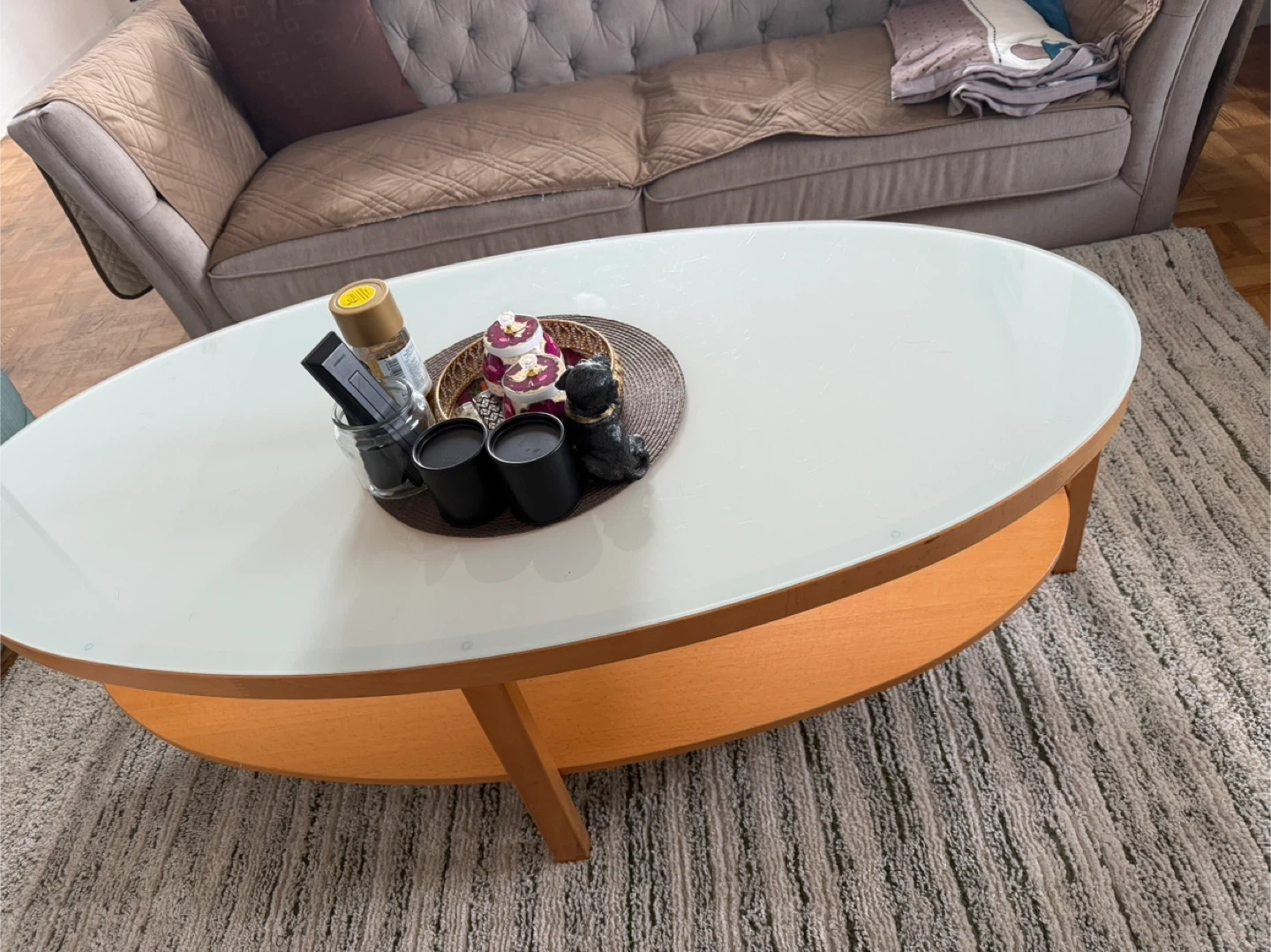 Oval coffee table with a white frosted glass top and a light wood base. It's a nice size for a living room. This table would be useful for placing drinks and decor.