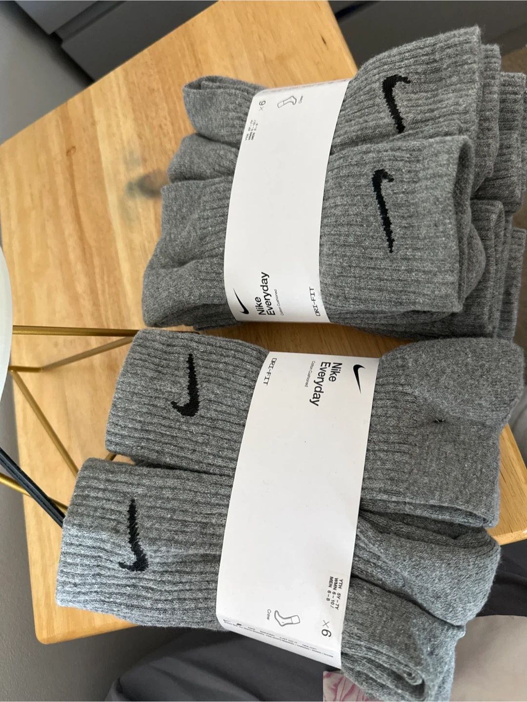A 6-pack of Nike Everyday Cotton Cushioned crew socks in grey. They feature Dri-FIT technology for moisture management. These socks are designed for comfort during daily wear.
