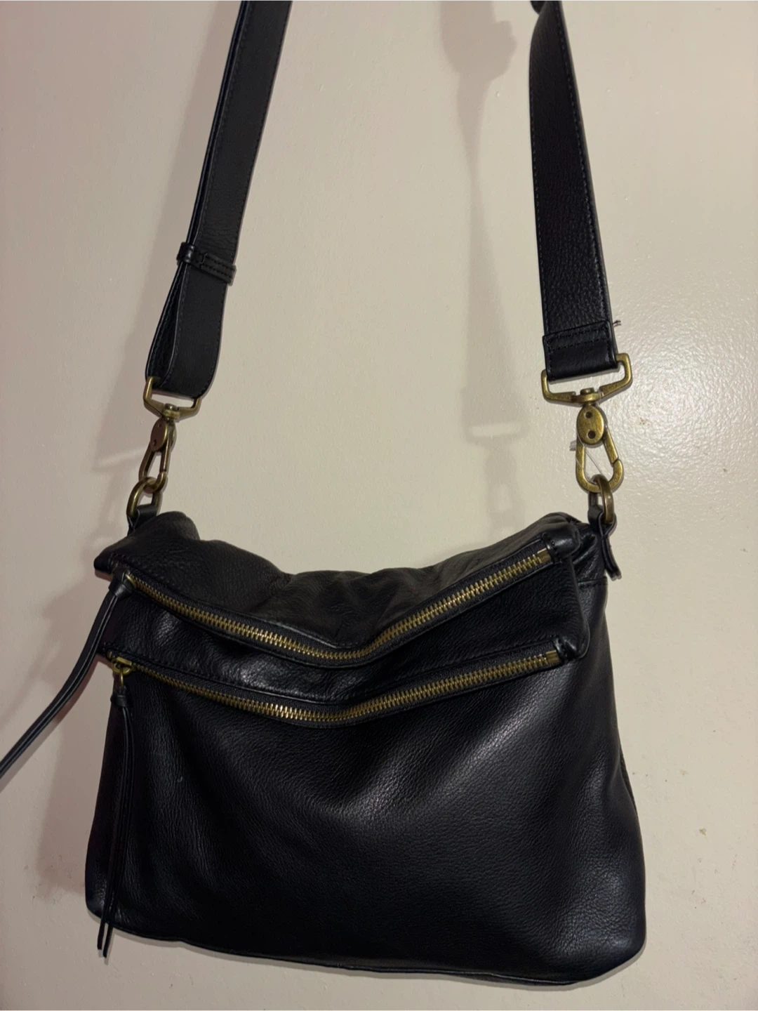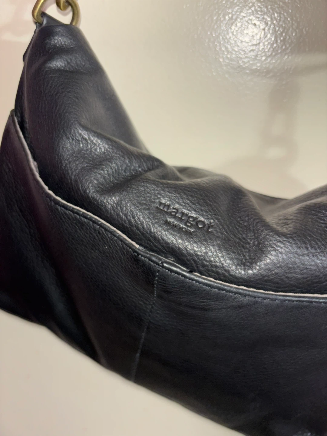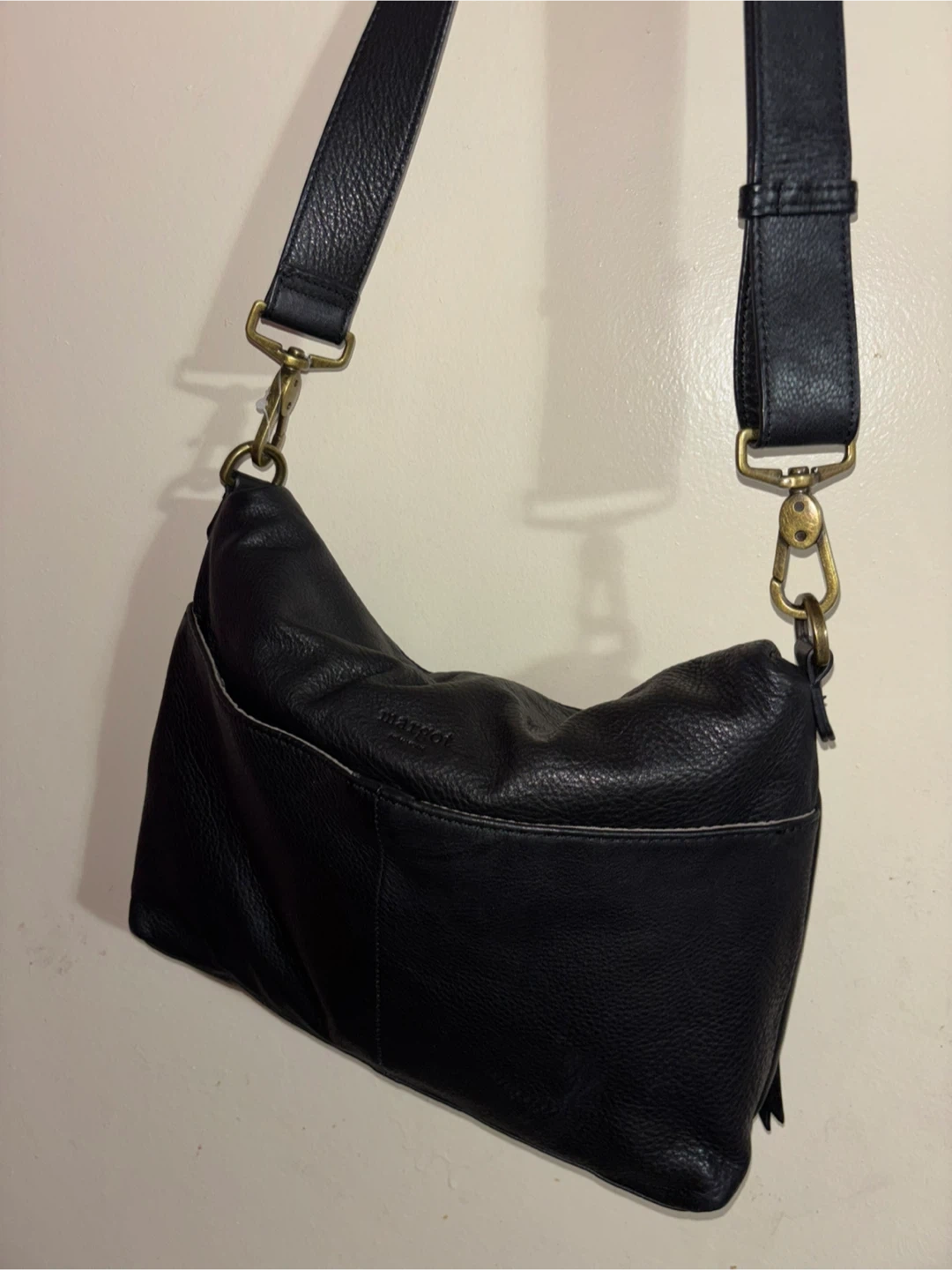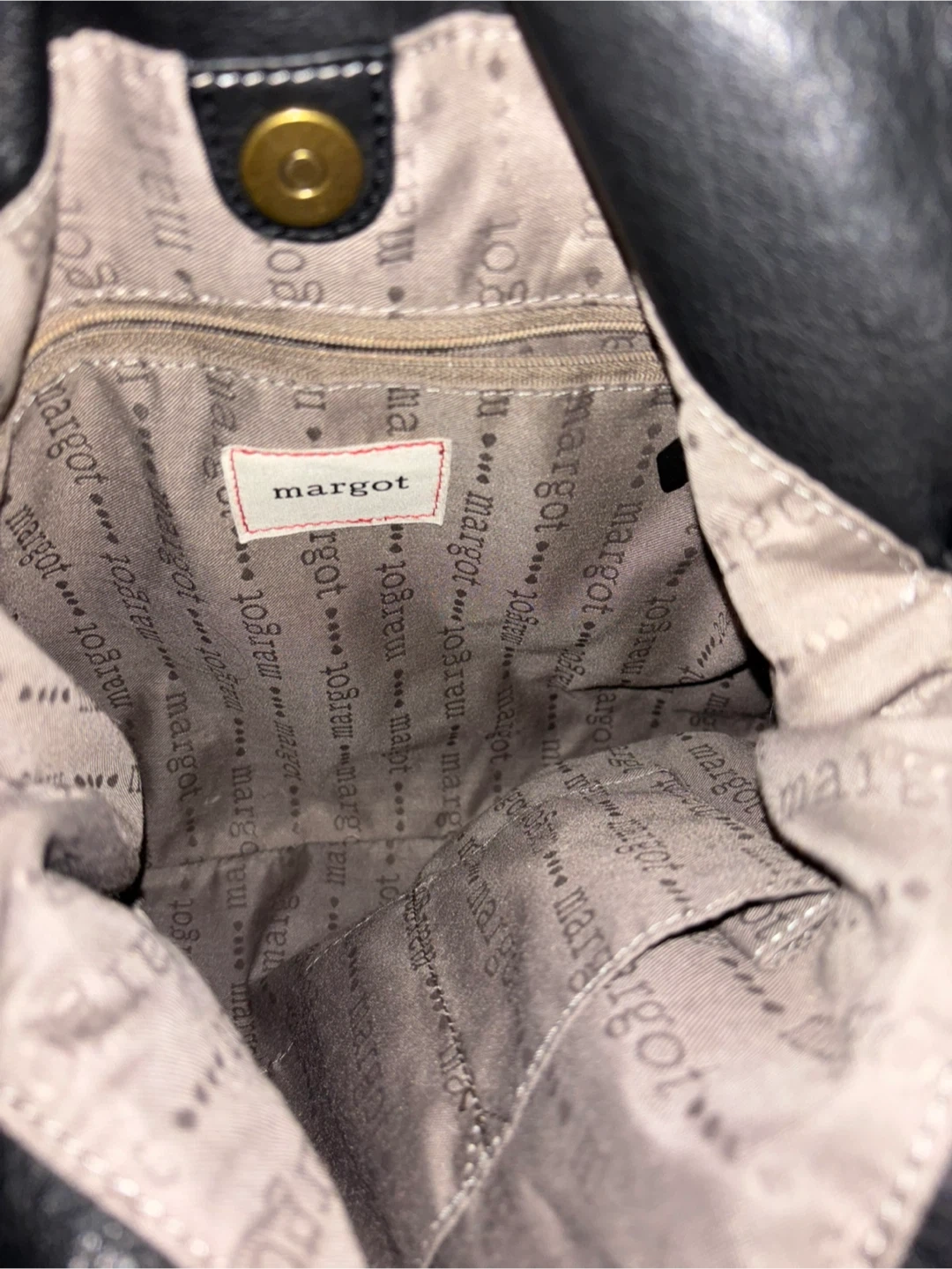 This Margot New York crossbody bag is made of black leather. It features multiple zippered compartments for organization. The adjustable strap allows for comfortable wear.