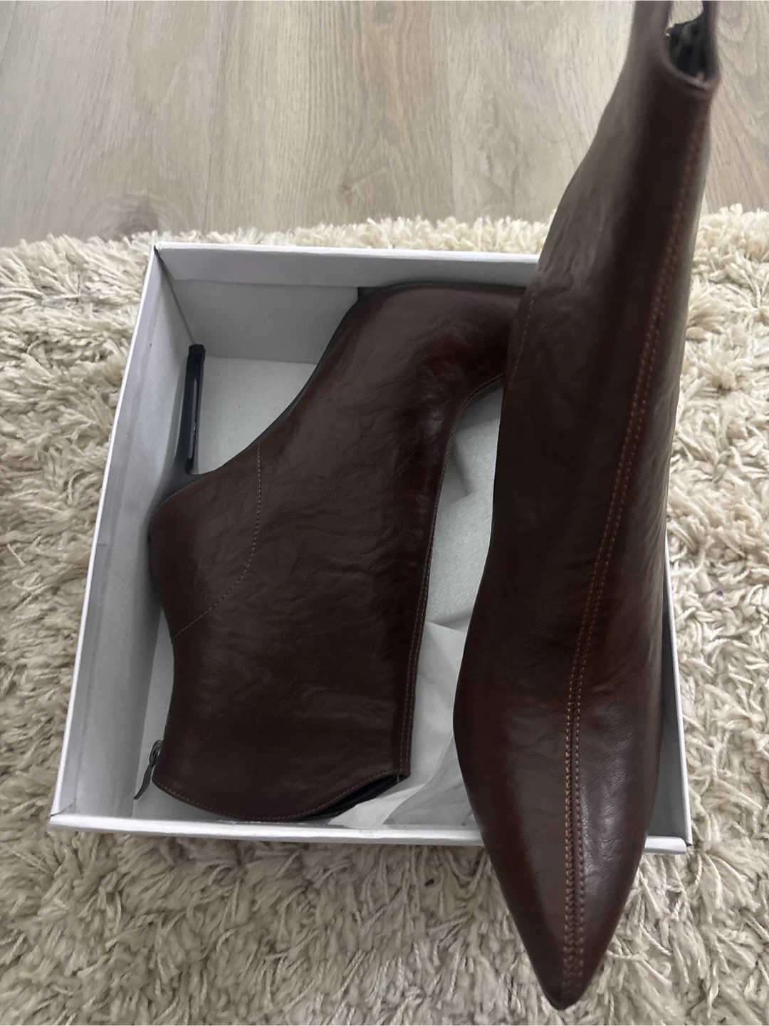 Brand new These brown leather ankle boots feature a pointed toe and a sleek stiletto heel. The size is marked as EUR 42. They come with their original box.