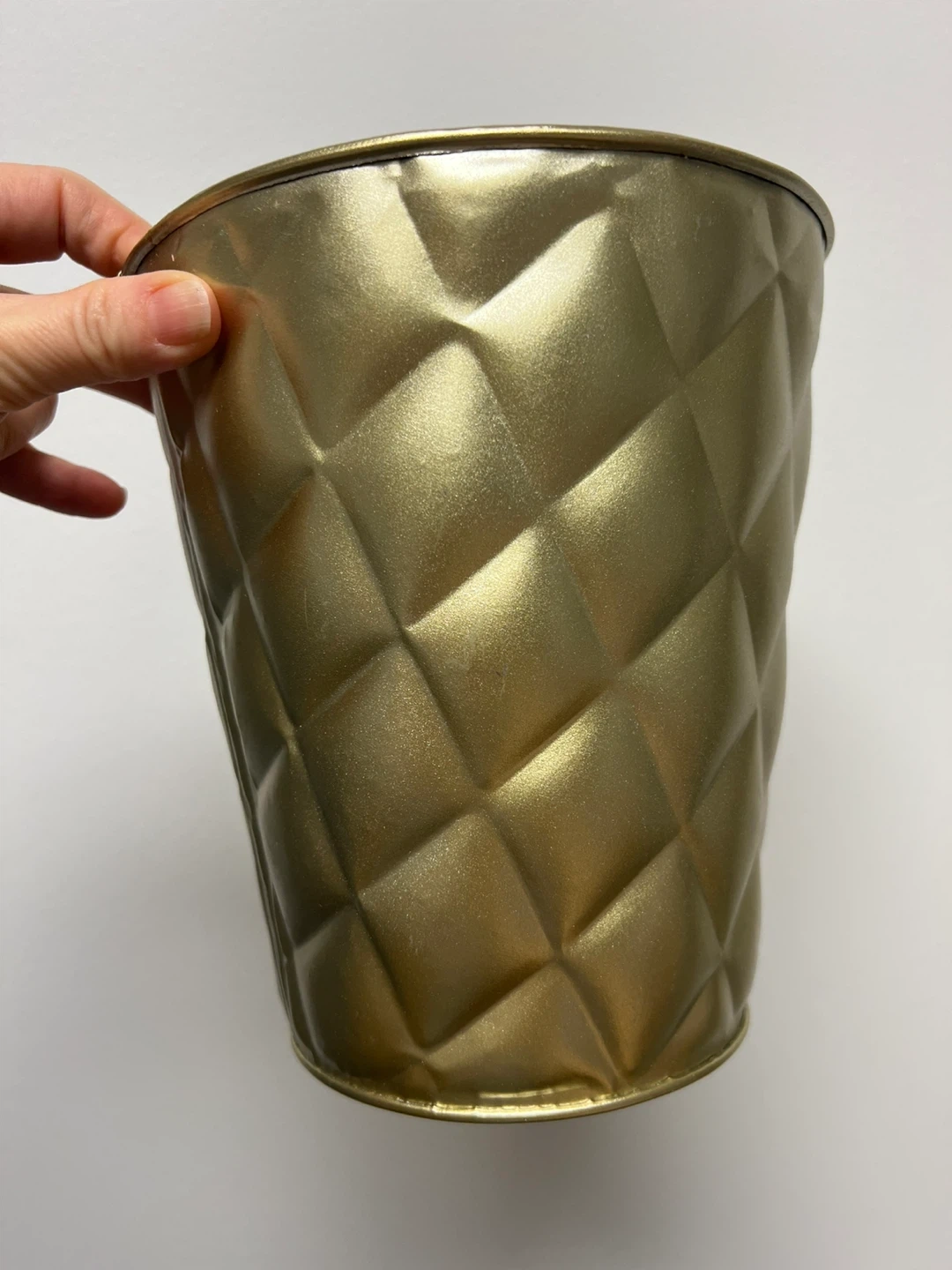 This gold metal waste bin features a diamond pattern design. It's a sturdy bin perfect for a home office or bedroom. Metal construction.