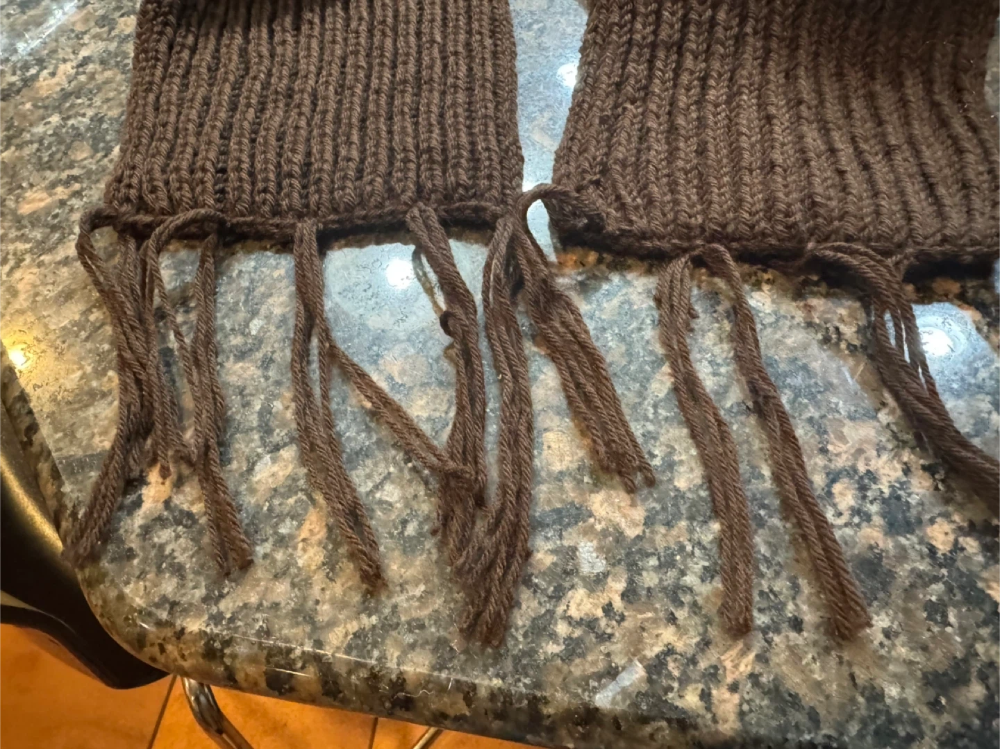 I'm selling a hand-knitted scarf and headband set in a lovely brown colour. The scarf has tassels at the ends, and the headband has a twisted design. Perfect for keeping cozy!
