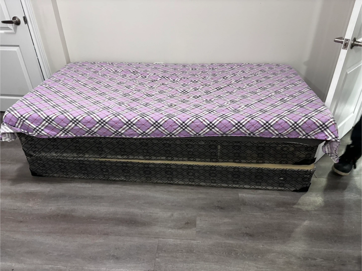 This is a queen-sized mattress and bed frame set. The mattress is covered with a light purple plaid throw. The bed frame has a patterned grey fabric.