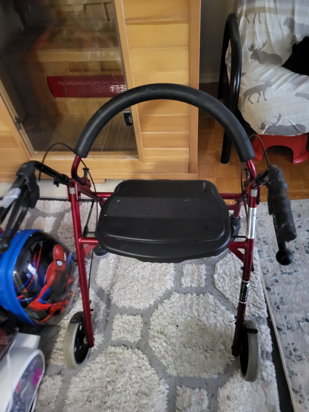 This is a red 3-wheel rollator walker. It features a built-in seat for resting. The handles are adjustable for height.