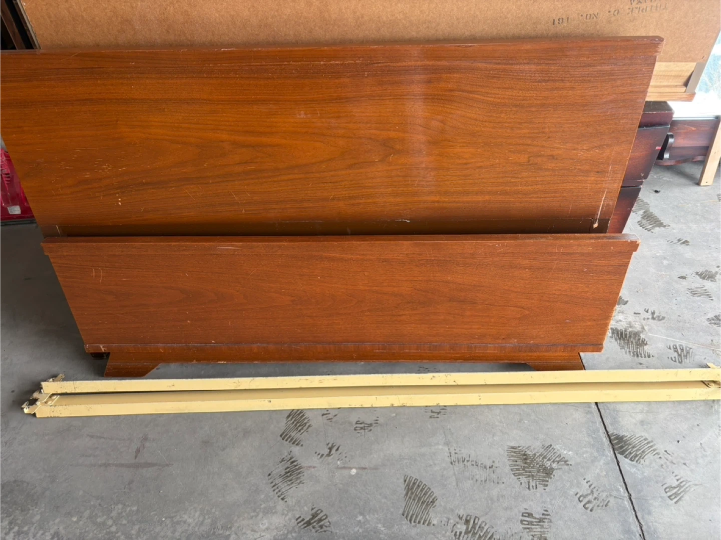 This is a used bed frame with a charming, classic design, perfect for adding a touch of vintage style to your bedroom; it includes a headboard, footboard, and side rails. As a used item, it shows signs of wear, which only adds to its character. It come with four big planks to support the mattress.
