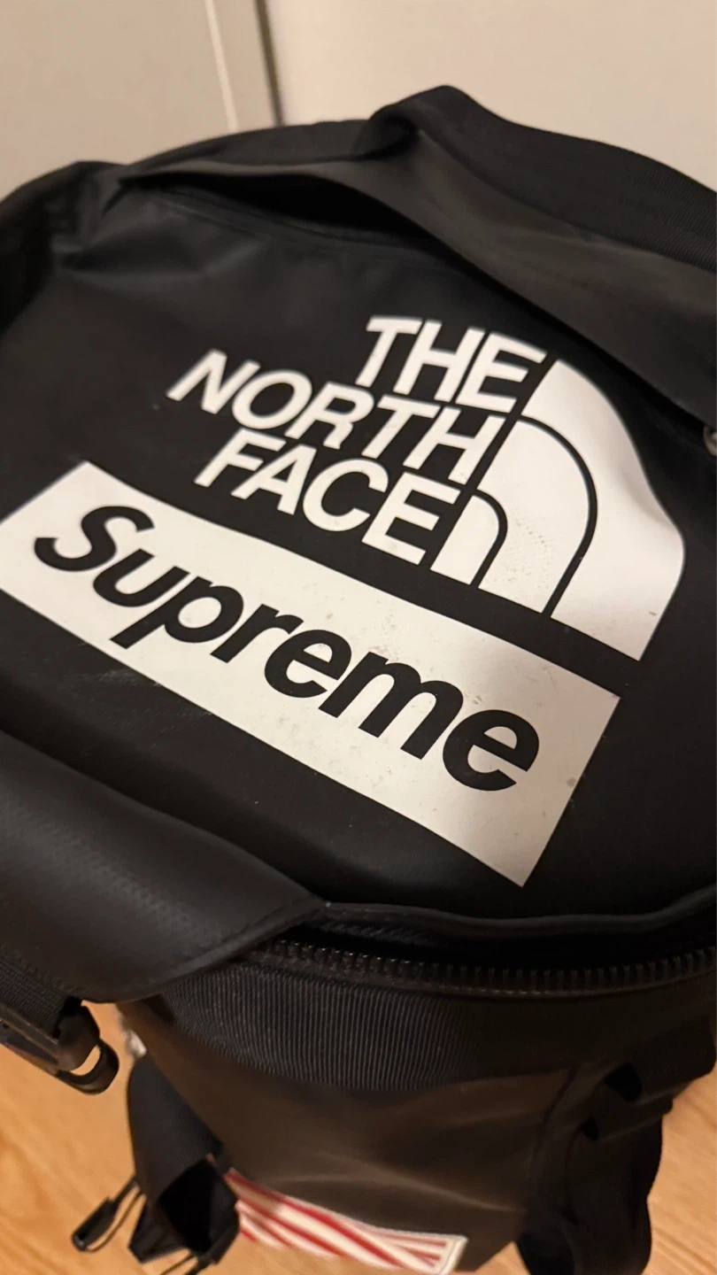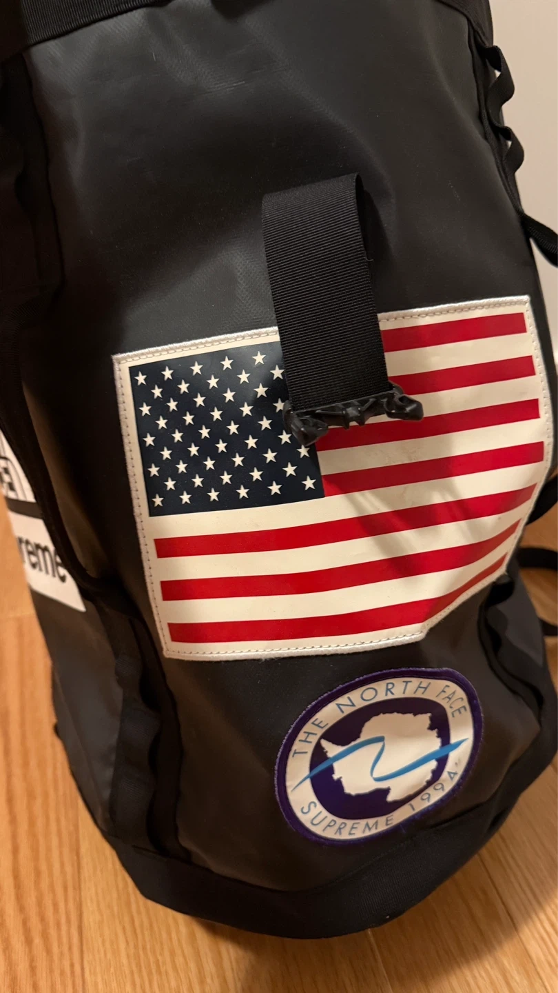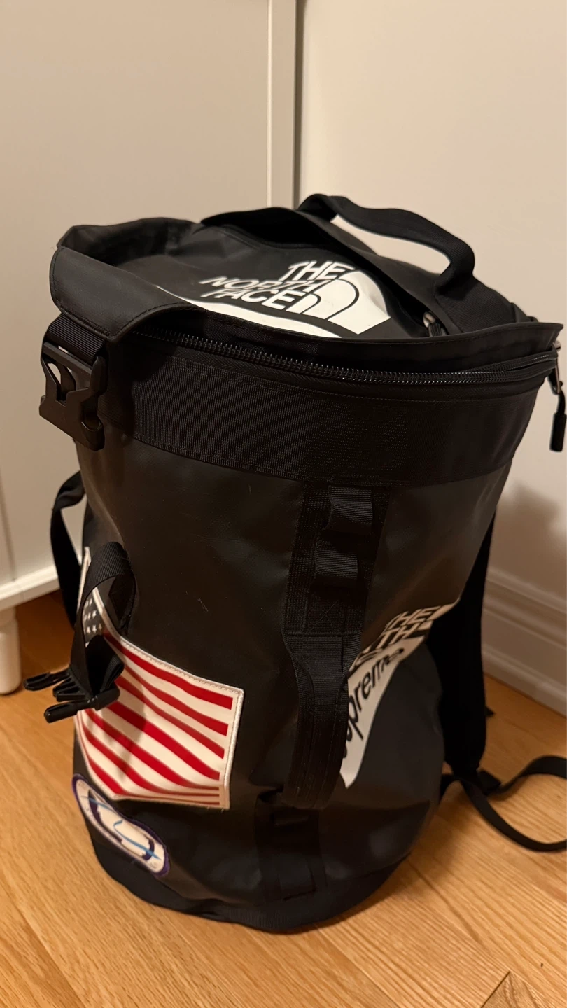 Black waterproof duffle bag from The North Face and Supreme collaboration. Features American flag patch and 'Supreme 1994' logo detail. Durable construction.