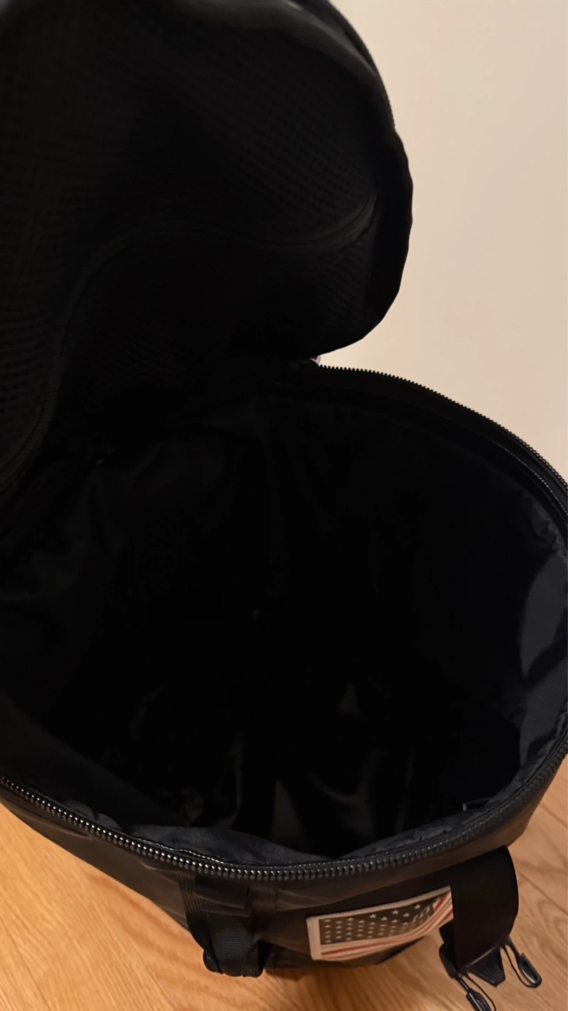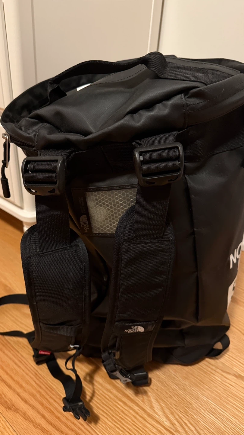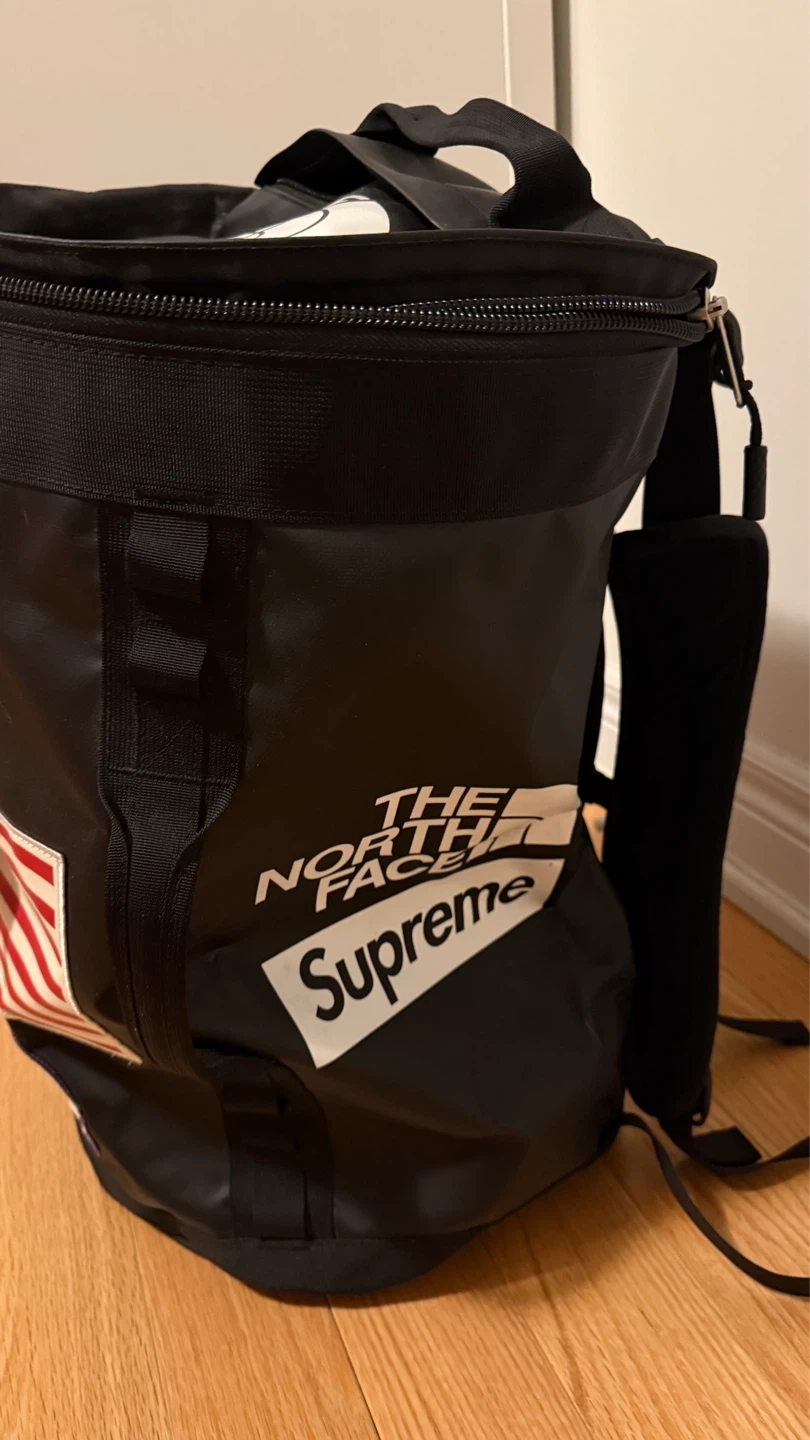 Black waterproof duffle bag from The North Face and Supreme collaboration. Features American flag patch and 'Supreme 1994' logo detail. Durable construction.