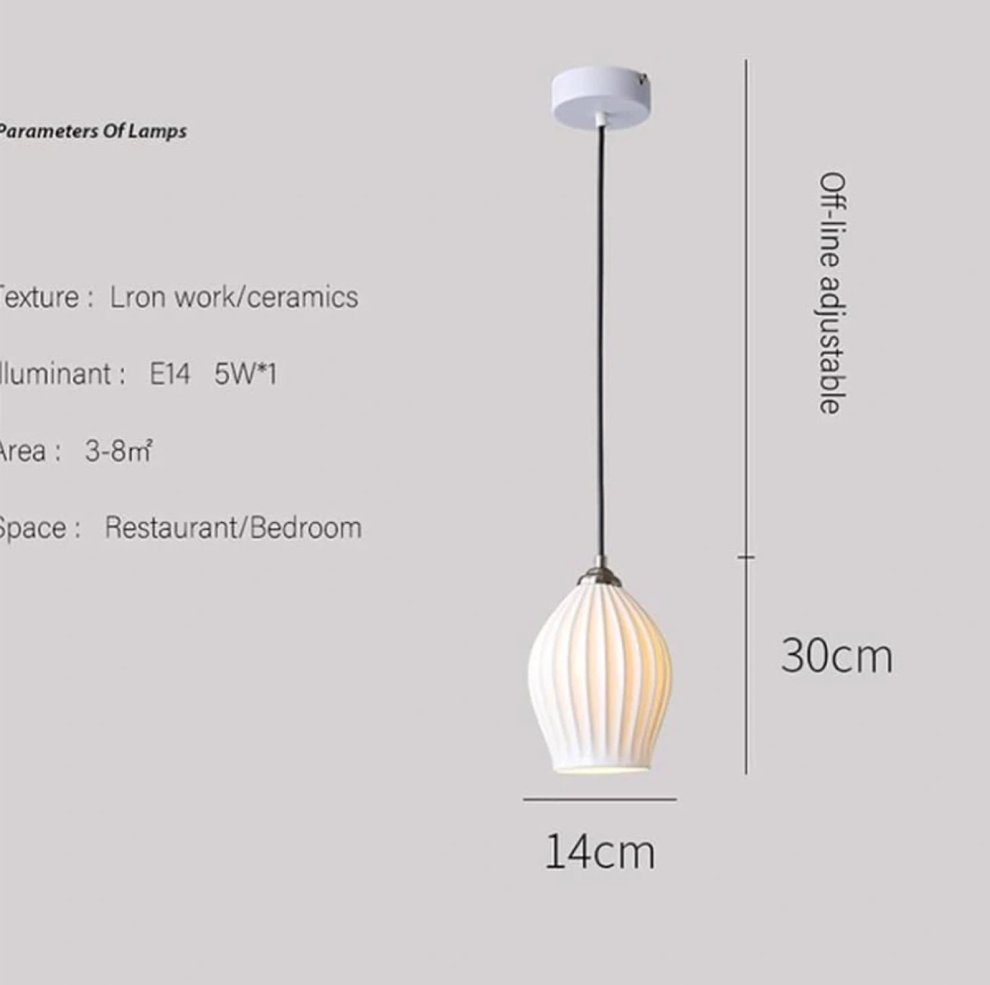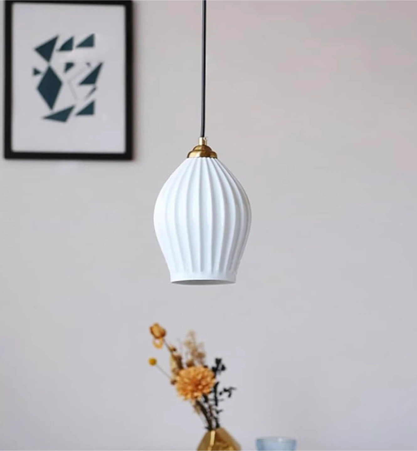White ceramic pendant light with a fluted design. It uses an E14 5W*1 illuminant and is suitable for areas between 3-8m². It's great for kitchens, reading nook’s & bedrooms.