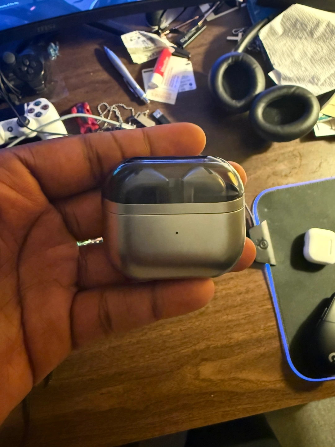 Comes with original box. Gray coloured charging case. Earbuds are silver and black. A great item to enjoy some of your favourite music.