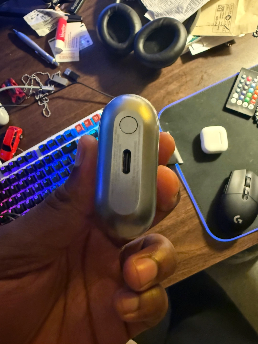 Comes with original box. Gray coloured charging case. Earbuds are silver and black. A great item to enjoy some of your favourite music.
