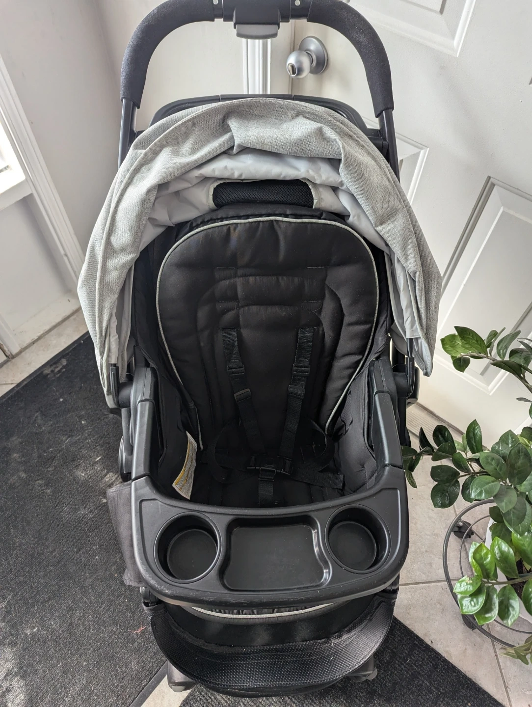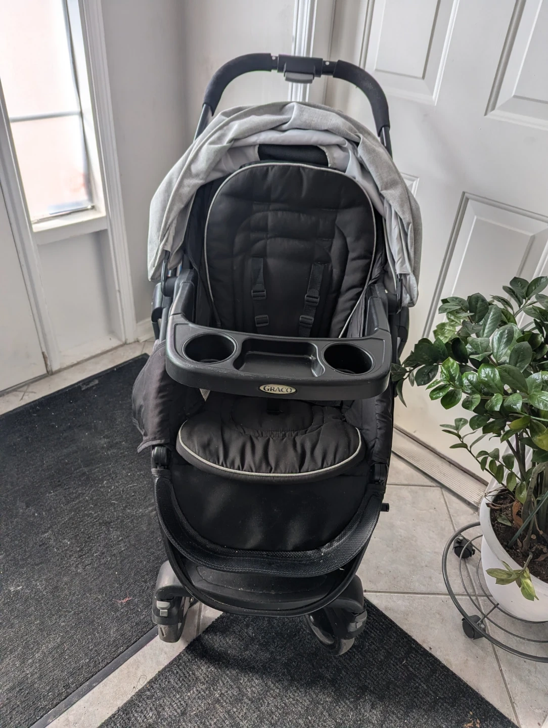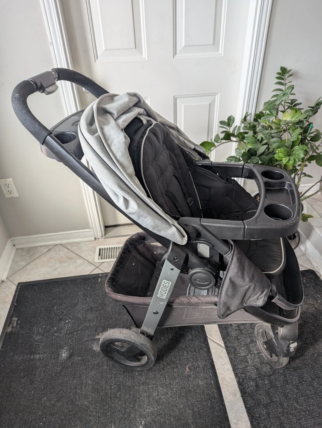 This Graco Modes stroller is black and grey. It features a parent cup holder and a snack tray for your little one. It also has a large storage basket underneath.