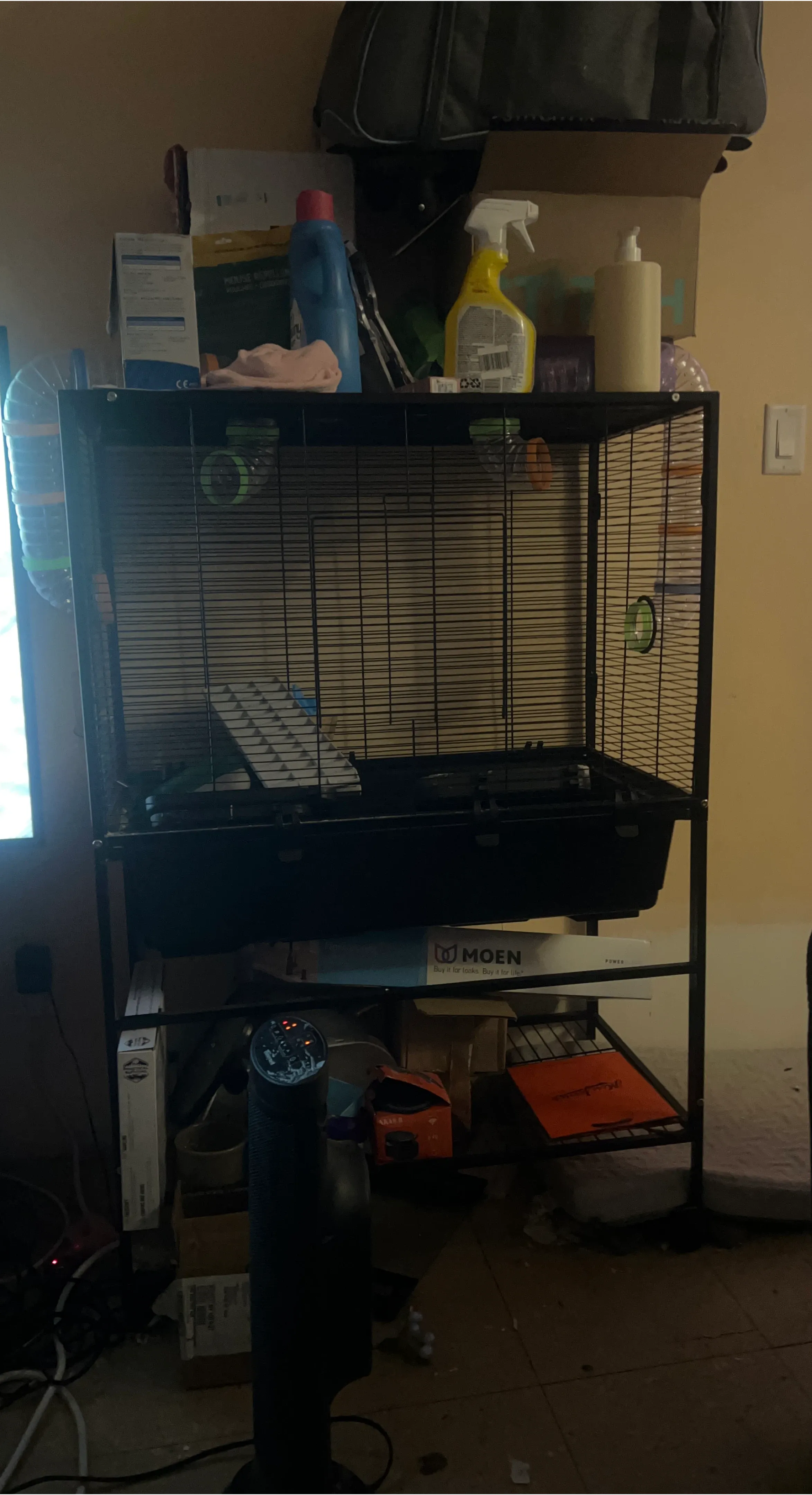 This is a 32" large hamster cage from PawHut. It's designed with multiple levels, storage shelves, and includes tubes and a running wheel. The cage also comes with a water bottle. It's suitable for hamsters. Cash and carry only.