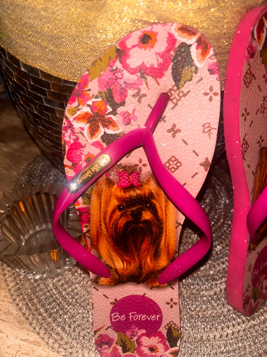 Cute pink flip-flops featuring a Yorkie dog graphic and floral print. "Be Forever" text on the soles. Perfect for a beach day or casual wear! Adorable Be Forever flip-flops featuring a floral design with a cute dog illustration. Lightweight and comfortable with flexible straps. Perfect for vacations, beach days, poolside lounging, or casual summer wear.