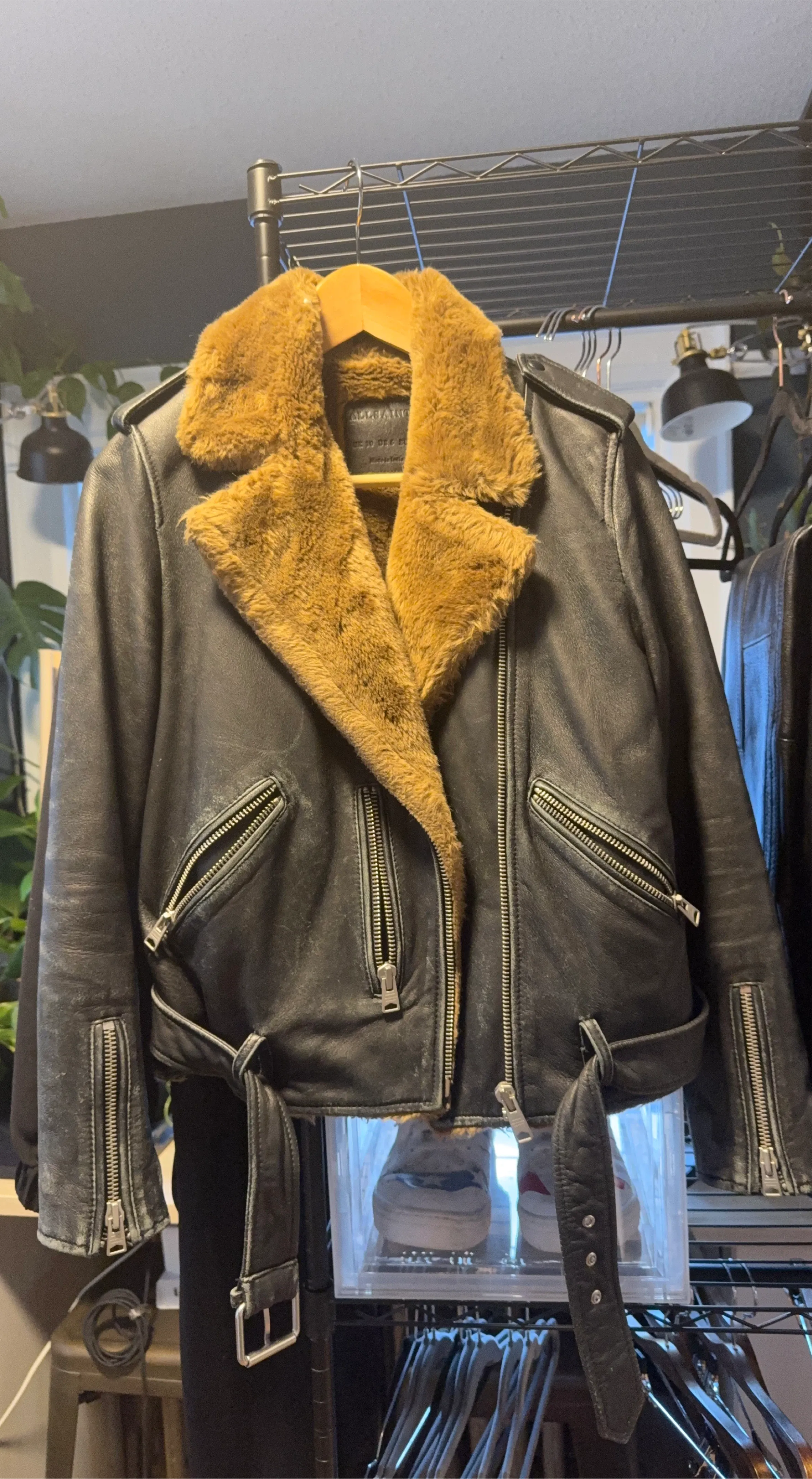 This is an AllSaints black leather biker jacket. It features a cozy faux fur lining and collar for extra warmth. The jacket includes multiple zippered pockets and a belt detail at the hem. It's perfect for staying stylish and warm during cooler weather!