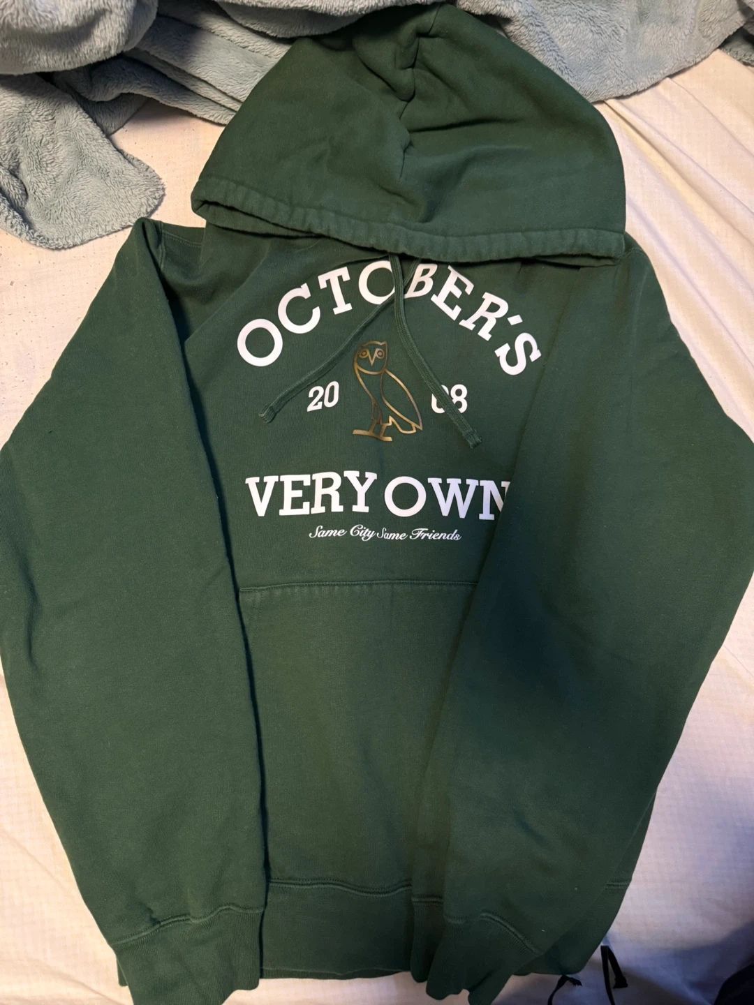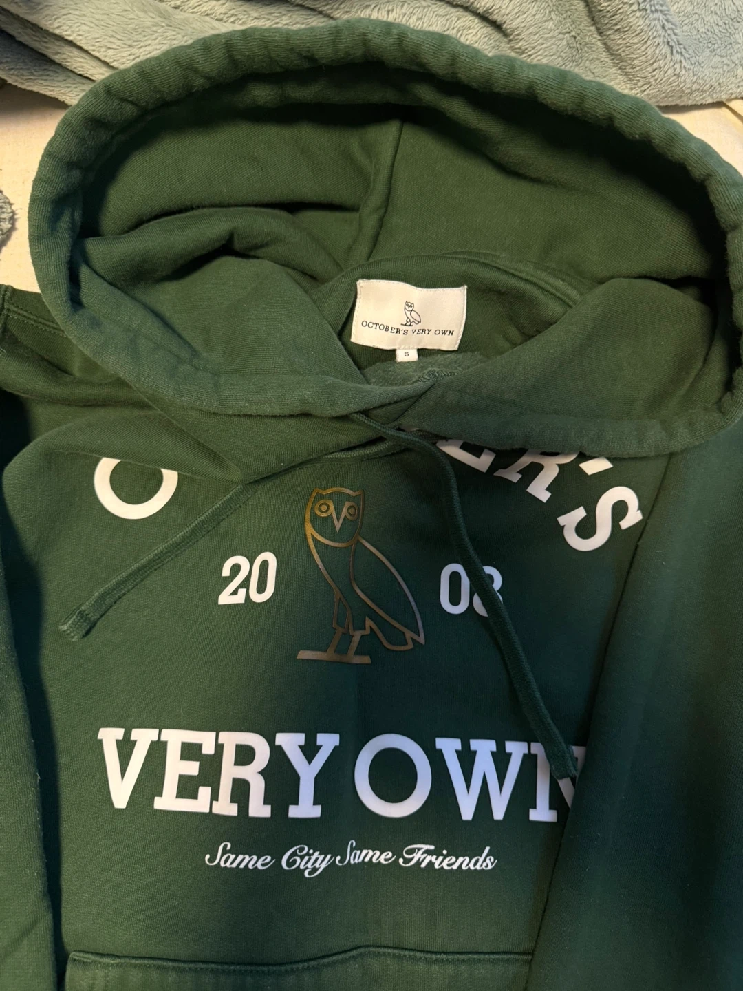 This is an OVO October's Very Own hoodie in green. It features the brand's signature owl logo and "Very Own" graphic. The size is small. Brand new never worn.