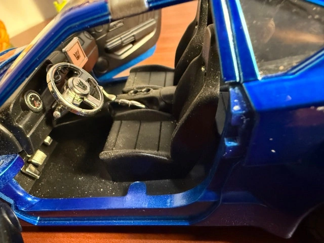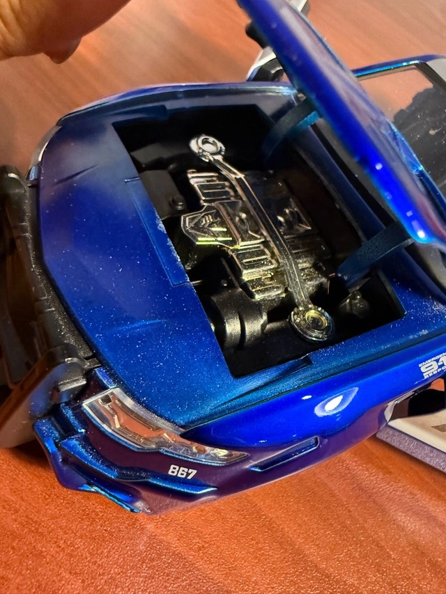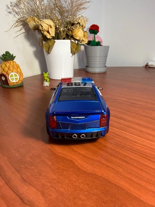 This Jada 1/24 scale diecast police car has a cool Transformers-inspired design in a sharp blue and white color scheme. It's in used condition with some minor wear but still looks great for display or play. Features include a detailed interior and exterior, realistic police decals, a diecast metal body, and free-rolling wheels. Asking $30. If the ad is up, it's available!