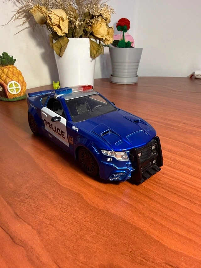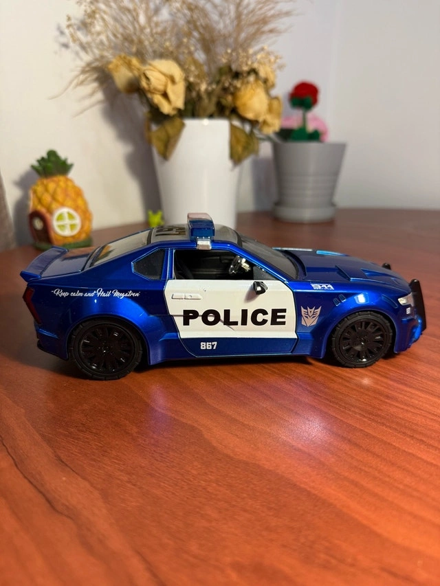 This Jada 1/24 scale diecast police car has a cool Transformers-inspired design in a sharp blue and white color scheme. It's in used condition with some minor wear but still looks great for display or play. Features include a detailed interior and exterior, realistic police decals, a diecast metal body, and free-rolling wheels. Asking $30. If the ad is up, it's available!