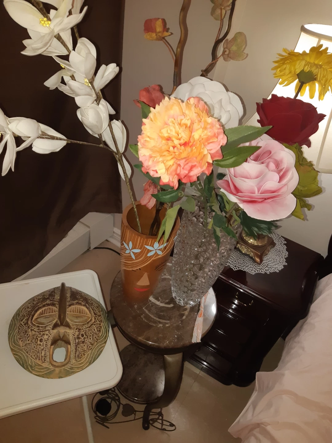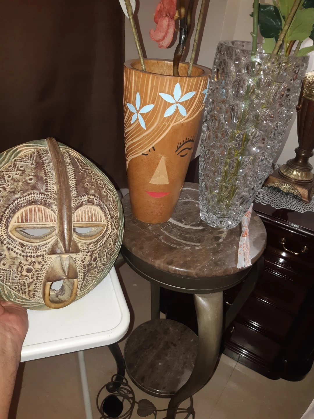 A unique carved wall mask with intricate patterns and a decorative vase featuring a painted face. Both pieces add a touch of global flair to your home decor. Perfect for adding artistic interest to any room!