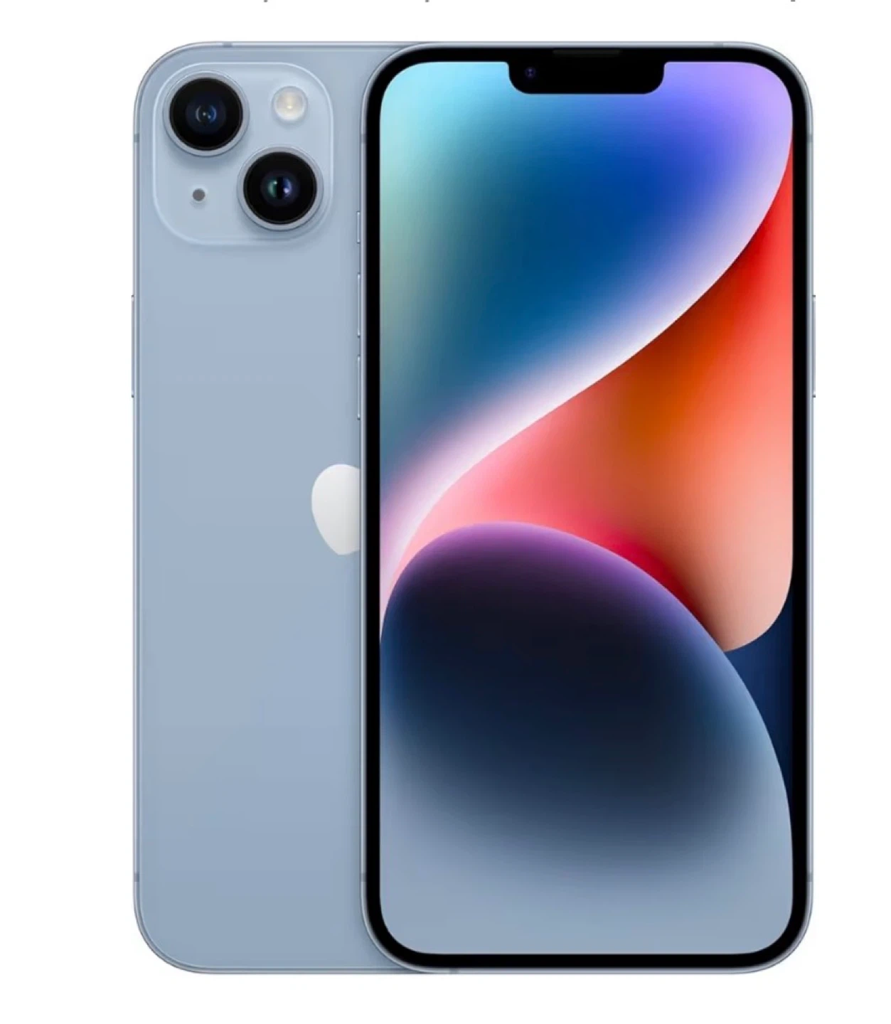 This is an Apple iPhone 14. It's a blue model with a dual-camera system. It has a notch for the front camera and sensors.