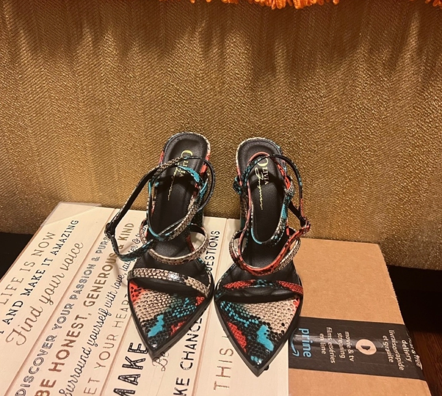 Beautiful multicoloured heels with a snake print design. They are ankle strap heels with a pointed toe. Height 4.25 inch