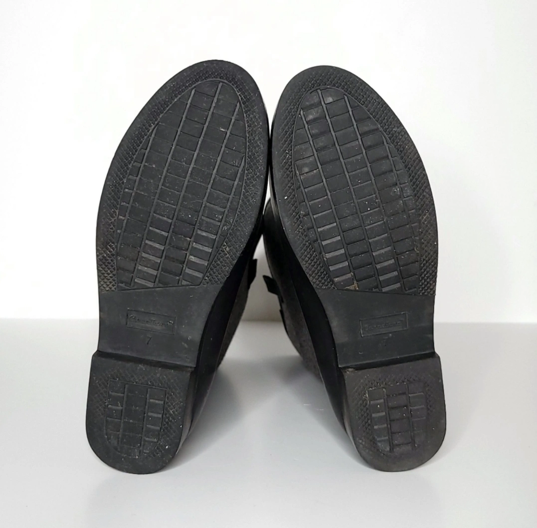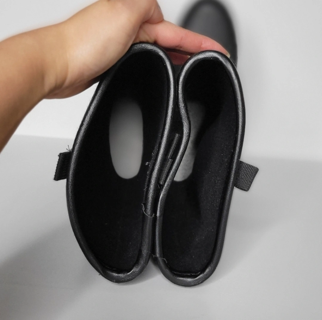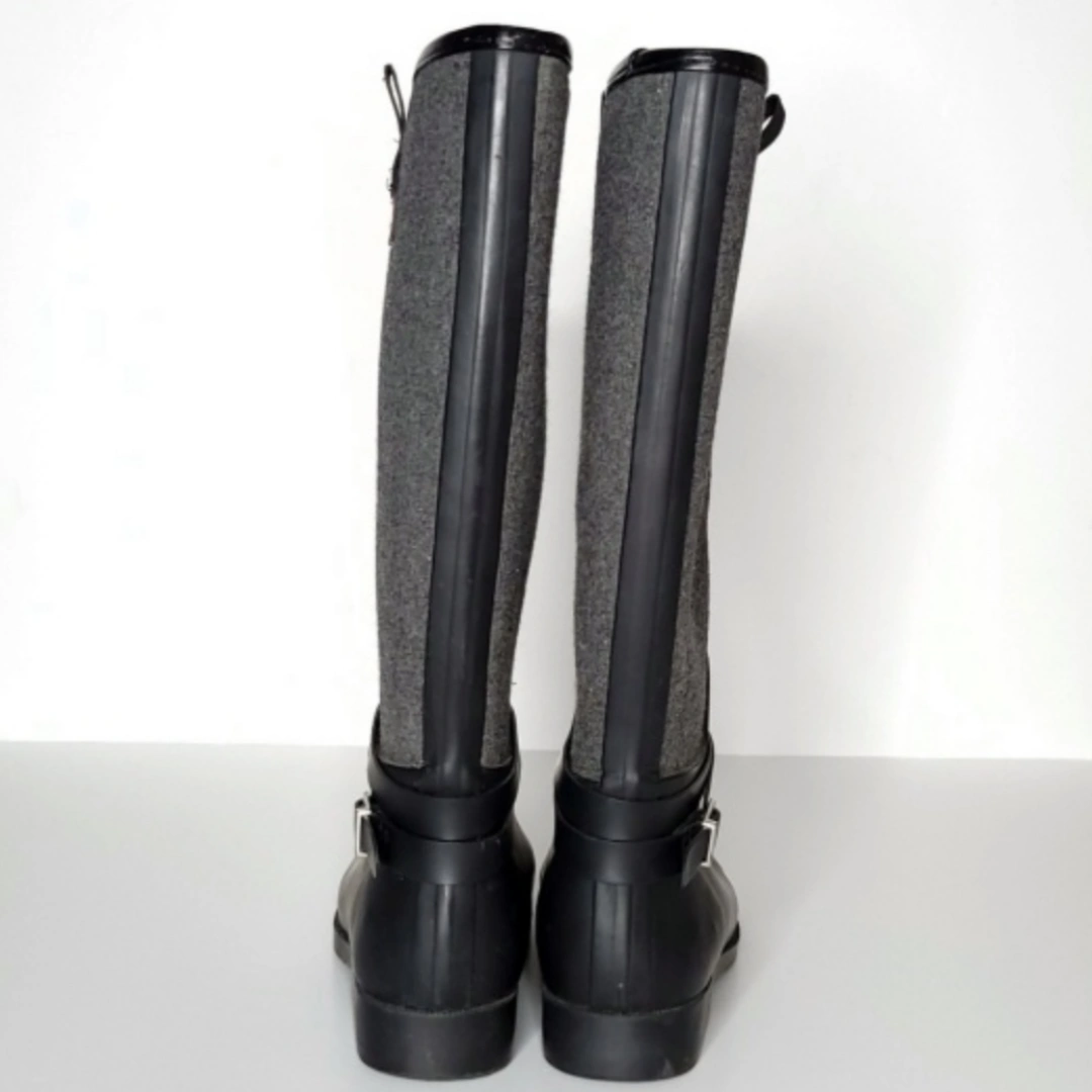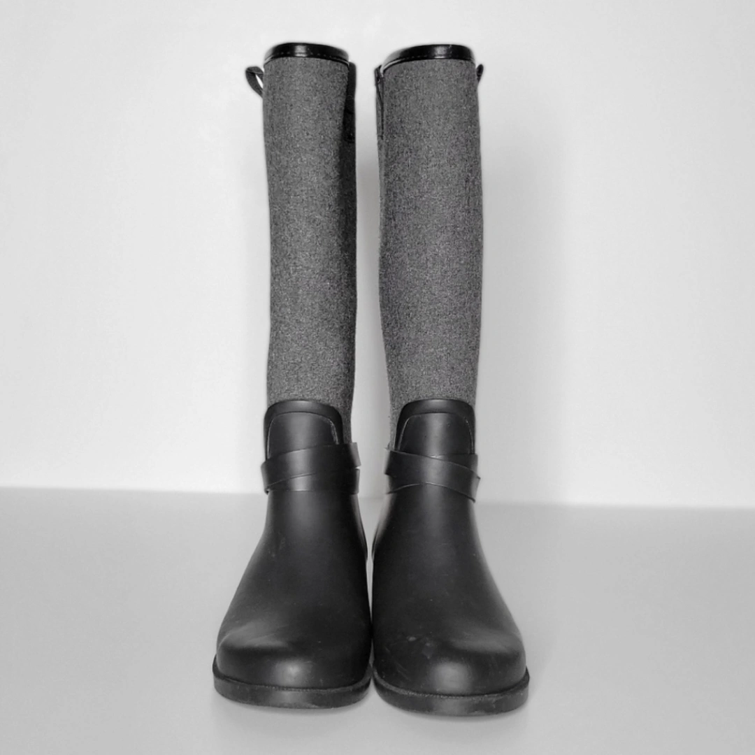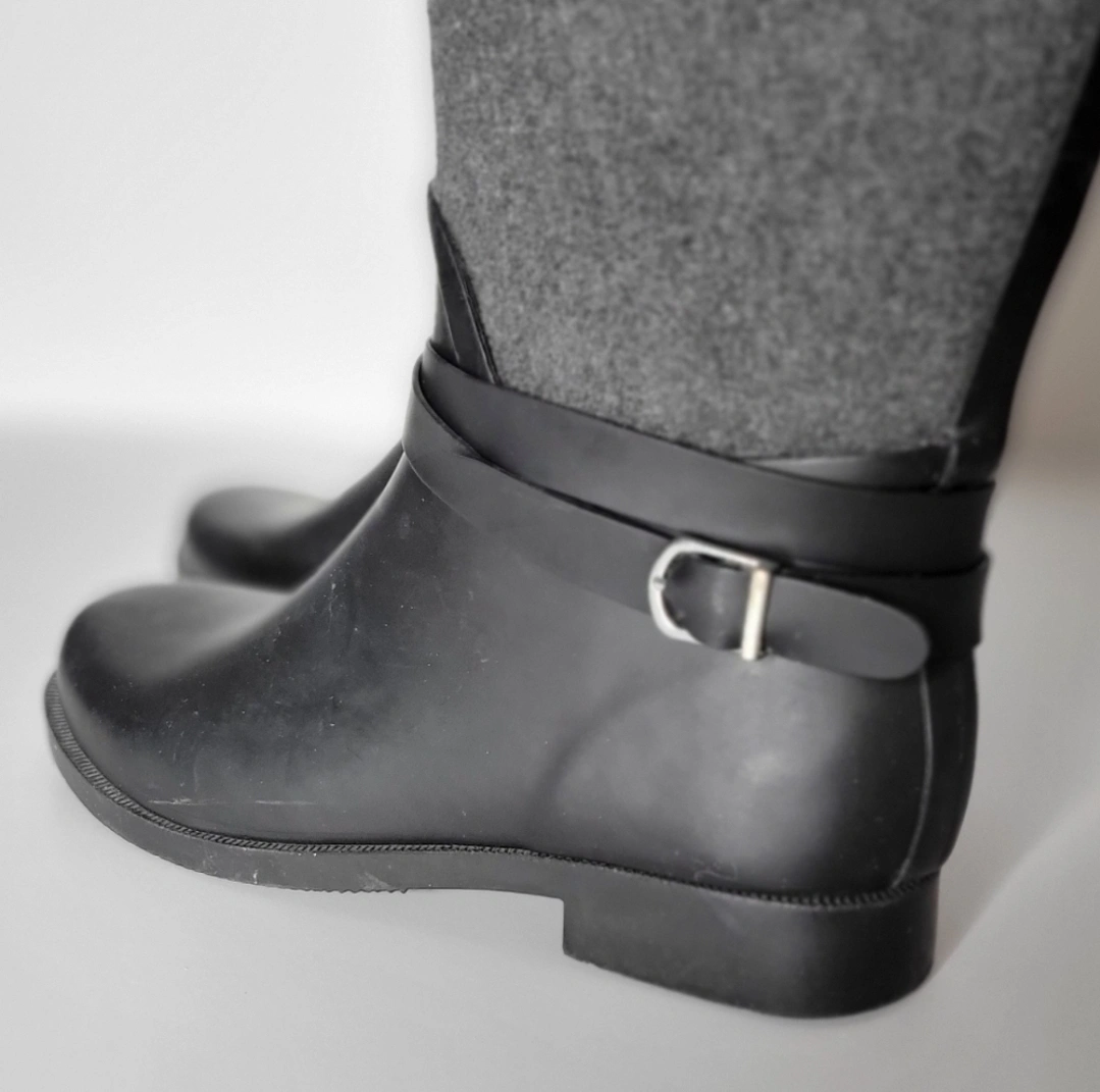 Black rubber boots with grey felt lining. Buckle detail. Comfortable to wear in the rain or snow.